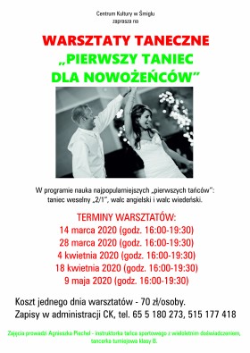 | Miejscowość: Śmigiel Miejsce: Centrum Kultury w Śmiglu Data rozpoczęcia: 14.03.2020 16:00:00 Data zakończenia: 09.05.2020 19:30:00 Organizator: Centrum Kultury w Śmiglu Opis wydarzenia: W programie nauka najpopularniejszych "pierszych tańców": taniec weselny "2/1", walc angielski i walc wiedeński. |