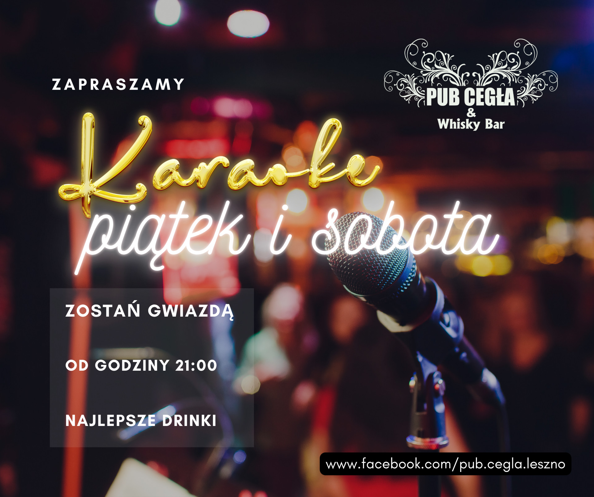 Miejscowość: Pub Cegła & Whisky Bar Miejsce: Leszno Data rozpoczęcia: 04.10.2025 21:00:00 Data zakończenia: 05.10.2025 01:00:00 Organizator: Pub Cegła & Whisky Bar Opis wydarzenia: Wyobraź sobie: światła skierowane na Ciebie, mikrofon w dłoni, a cała sala śpiewa razem z Tobą refren… brzmi jak scena z koncertu? W Cegle to po prostu zwykły weekend. Nie liczy się perfekcja, liczy się vibe – i to, że przy barze zawsze czeka ekipa, która podchwyci każdy hit. A gdy potrzebujesz odwagi? Najlepsze drinki w mieście robią swoje. - W piątek otwieramy mikrofony i sprawdzamy, kto zacznie weekend z przytupem. - W sobotę wracamy po bis – bo w Cegle nikt nie wychodzi po jednej piosence. Masz już wybrany numer, który porwie tłum? Daj znać w komentarzu Pub Cegła | Piątek & Sobota | Start: 21:00 |