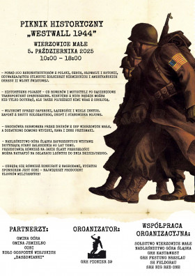 Miejscowość: Wierzowice Małe Miejsce: Wierzowice Małe Data rozpoczęcia: 05.10.2025 10:00:00 Data zakończenia: 05.10.2025 18:00:00 Organizator: GRH Pioner 39 Opis wydarzenia: Zapraszamy na wyjątkowe wydarzenie – Piknik Historyczny "Westwall 1944"! Data: 5 października Miejsce: Wierzowice Małe (gm. Góra) Ponad 200 rekonstruktorów odtwarzających sylwetki żołnierzy z okresu II wojny światowej, historyczne pojazdy, wojskowy sprzęt saperski, okopy, stanowiska bojowe, pyszna grochówka oraz konkursy z nagrodami. To nie tylko lekcja historii na żywo, ale także niezapomniana przygoda dla całej rodziny Nie może Was zabraknąć! |