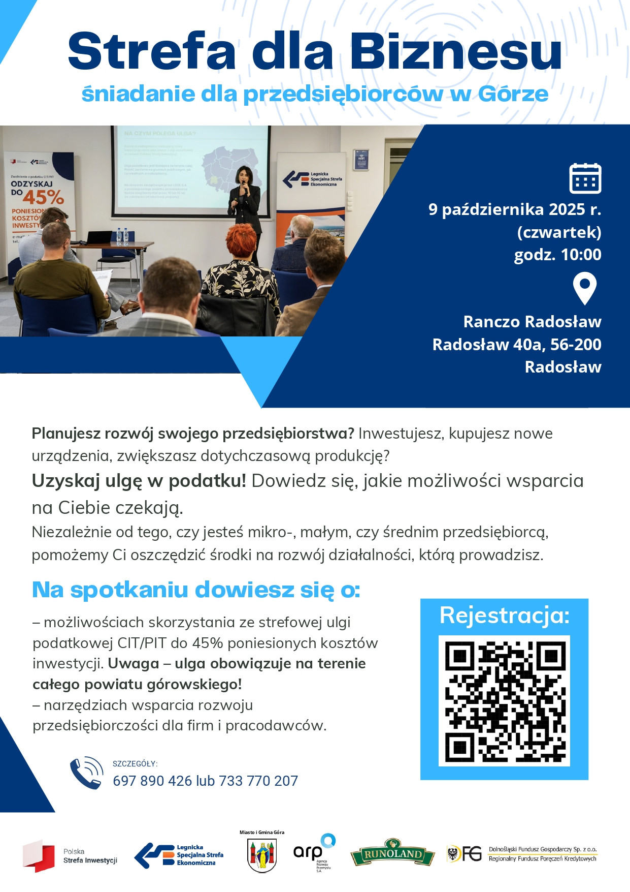 Miejscowość: Radosław Miejsce: Ranczo Radosław Data rozpoczęcia: 09.10.2025 10:00:00 Data zakończenia: 09.10.2025 13:00:00 Organizator: Legnicka Specjalna Strefa Ekonomiczna, Gmina Góra Opis wydarzenia: Zapraszamy wszystkich przedsiębiorców gminy Góra do wzięcia udziału w spotkaniu "Strefa dla Biznesu"! 9 października 2025 r., godz. 10:00 Ranczo Radosław Podczas spotkania poruszone zostaną tematy dot. potencjału gospodarczego Miasta i Gminy Góra, rozwoju biznesu, sposobów na obniżenie kosztów prowadzenia działalności, w tym obniżenia podatków czy dopasowania finansowania do istniejących potrzeb. Organizatorami wydarzenia są: Polska Strefa Inwestycji, Legnicka Specjalna Strefa Ekonomiczna, Gmina Góra, Agencja Rozwoju Przemysłu S.A., Runoland, Dolnośląski Fundusz Gospodarczy Sp. z o.o., Regionalny Fundusz Poręczeń Kredytowych. Link do rejestracji: https://forms.office.com/e/uwSCWNE1Ce Niezależnie od tego, czy jesteś mikro, małym, czy średnim przedsiębiorcą, przyjdź i dowiedz się jak oszczędzać środki na rozwój działalności, którą prowadzisz. |