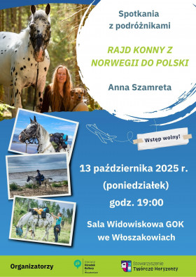 Miejscowość: Włoszakowice Miejsce: Sala Widowiskowa GOK Data rozpoczęcia: 13.10.2025 19:00:00 Data zakończenia: 13.10.2025 12:00:00 Organizator: Gminny Ośrodek Kultury we Włoszakowicach i Stowarzyszenie Twórcze Horyzonty Opis wydarzenia: Sześć krajów i blisko 2000 kilometrów na koniu? O tak! Gminny Ośrodek Kultury oraz Stowarzyszenie Twórcze Horyzonty serdecznie zapraszają na kolejne Spotkanie z podróżnikami. Naszym gościem będzie Anna Szamreta – współczesna nomadka przemierzająca Europę w rytmie końskich i psich kroków. Bądźcie z nami 13 października o godz. 19:00 w Sali Widowiskowej GOK. Te spotkania to już włoszakowicka tradycja – przygoda, inspiracja i rozmowy z fascynującymi ludźmi. Po wakacyjnej przerwie wracamy z przytupem. Gościem będzie podróżniczka, trenerka koni i instruktorka jazdy konnej, artystka i prelegentka – Anna Szamreta. Ciągle szuka nieoczywistych ścieżek. W drodze jest już od 9 lat, a ostatnio przemierza Europę z koniem Mango i psem Oro. – Wystartowaliśmy z Norwegii i, próbując poruszać się jak najdzikszymi trasami, z dala od miast i autostrad, dotarliśmy do Polski – opowiada podróżniczka na swoim Facebooku. Wyruszyła późną wiosną 2024 roku, przemierzając 6 krajów i pokonując blisko 2000 km. Do Włoszakowic przyjedzie, by opowiedzieć, jak taka podróż zmienia perspektywę patrzenia na świat i jak cudownych ludzi można spotkać. Wprowadzi nas w życie w rytmie natury: biwaki nad jeziorami i rzekami, a czasem noclegi w skromnych stajniach – w których kluczem do sukcesu są współpraca, zaufanie i wzajemne wsparcie. Podzieli się historiami o niezwykłych miejscach, radościach i trudnościach, które stały się częścią tej drogi, a także refleksjami o koczowniczym życiu i poszukiwaniu wolności we współczesnym świecie. Bądźcie z nami – spotykamy się w poniedziałek, 13 października, o godz. 19:00 w Sali Widowiskowej GOK we Włoszakowicach. Wstęp wolny. Tego wieczoru przeniesiemy się do bliskiego naturze świata bez pośpiechu. (AL) |
