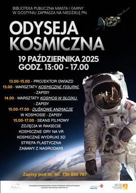 Miejscowość: Gostyń Miejsce: Biblioteka w Gostyniu Data rozpoczęcia: 19.10.2025 13:00:00 Data zakończenia: 19.10.2025 17:00:00 Organizator: Biblioteka Publiczna Miasta i Gminy w Gostyniu Opis wydarzenia: Data: niedziela, 19 października 2025 Godzina: 13:00 – 17:00 Miejsce: Biblioteka Publiczna Miasta i Gminy w Gostyniu Biblioteka Publiczna Miasta i Gminy w Gostyniu zaprasza dzieci, młodzież i całe rodziny na niezwykłą wyprawę w przestrzeń kosmiczną! „Odyseja Kosmiczna” to wydarzenie pełne nauki, zabawy i wyobraźni, podczas którego uczestnicy przeniosą się w świat planet, gwiazd i rakiet. Czeka Was dzień pełen międzygwiezdnych doświadczeń – od eksperymentów i warsztatów, po nowoczesne technologie VR i 3D. W programie: 13.00–15.00 – Projektor gwiazd 13.00 – Warsztaty „Kosmiczne figurki” – zapisy 14.00 – Warsztaty „Kosmos w słoiku” – zapisy 15.00–17.00 – Duśkowe animacje w kosmosie – zapisy 15.00–17.00 – Seans filmowy Dodatkowo przez cały czas trwania wydarzenia: zdjęcia w rakiecie, kosmiczne gry na VR, kosmiczne wydruki 3D, strefa plastyczna, zabawy z nagrodami Zapisy pod numerem: 730 800 787 Wydarzenie organizowane w ramach programu profilaktycznego „Akademia Pożytecznej Rozrywki 3.0”. |