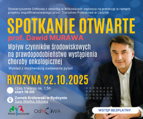 Miejscowość: Rydzyna Miejsce: Zamek Królewski - Sala Wielka Alkowa Data rozpoczęcia: 22.10.2025 18:00:00 Data zakończenia: 22.10.2025 20:00:00 Organizator: Stowarzyszenie OdNowa z Wilkowic Opis wydarzenia: Stowarzyszenie OdNowa z siedzibą w Wilkowicach zaprasza na spotkanie otwarte z prof. Dawidem Murawą, dyrektorem Szpitala Wojewódzkiego w Poznaniu oraz kierownikiem Katedry Chirurgii i Onkologii Collegium Medicum Uniwersytetu Zielonogórskiego. Tematem wykładu będzie „Wpływ czynników środowiskowych na prawdopodobieństwo wystąpienia choroby onkologicznej”. W programie przewidziano wystąpienie profesora oraz możliwość zadawania pytań. Wydarzenie realizowane jest w ramach projektu współfinansowanego przez Starostwo Powiatowe w Lesznie. |
