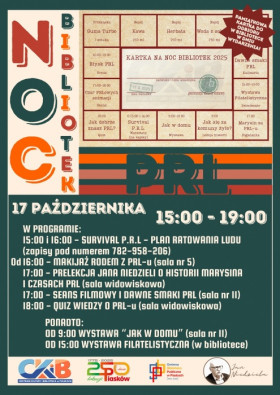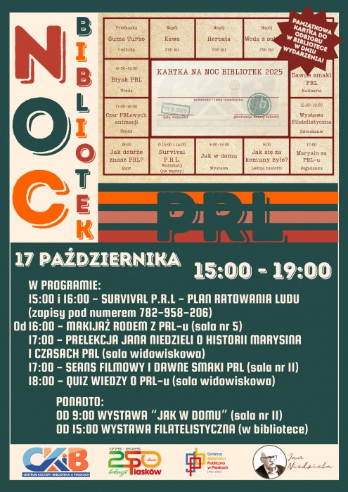 Miejscowość: Piaski Miejsce: Centrum Kultury i Biblioteki w Piaskach Data rozpoczęcia: 17.10.2025 15:00:00 Data zakończenia: 17.10.2025 19:00:00 Organizator: Centrum Kultury i Biblioteka w Piaskach Opis wydarzenia: NOC BIBLIOTEK 2025 – PRL w Piaskach! Wskakujcie w klimat dawnych lat i przenieście się z nami do czasów PRL-u! Czeka na Was wyjątkowa podróż w czasie — pełna wspomnień, zabawy i niespodzianek! 17 października 2025 r. 15:00 – 19:00 Centrum Kultury i Biblioteka w Piaskach W PROGRAMIE: 15:00 i 16:00 – Survival PRL – Plan Ratowania Ludu (zapisy: 782 958 206) 16:00 – Makijaż rodem z PRL-u 17:00 – Prelekcja Jana Niedzieli o historii Marysina i czasach PRL 17:00 – Seans filmowy i dawne smaki PRL 18:00 – Quiz wiedzy o PRL-u A to nie wszystko! Od rana będziecie mogli zobaczyć: Wystawę „Jak w domu” (od 9:00) Wystawę filatelistyczną (od 15:00 w bibliotece) Uczestnicy otrzymają pamiątkową kartkę na Noc Bibliotek 2025 – do odbioru w dniu wydarzenia! Zabierzcie rodzinę, przyjaciół i dobry humor – wracamy do czasów oranżady w proszku, kartek na cukier i gumy Turbo! |