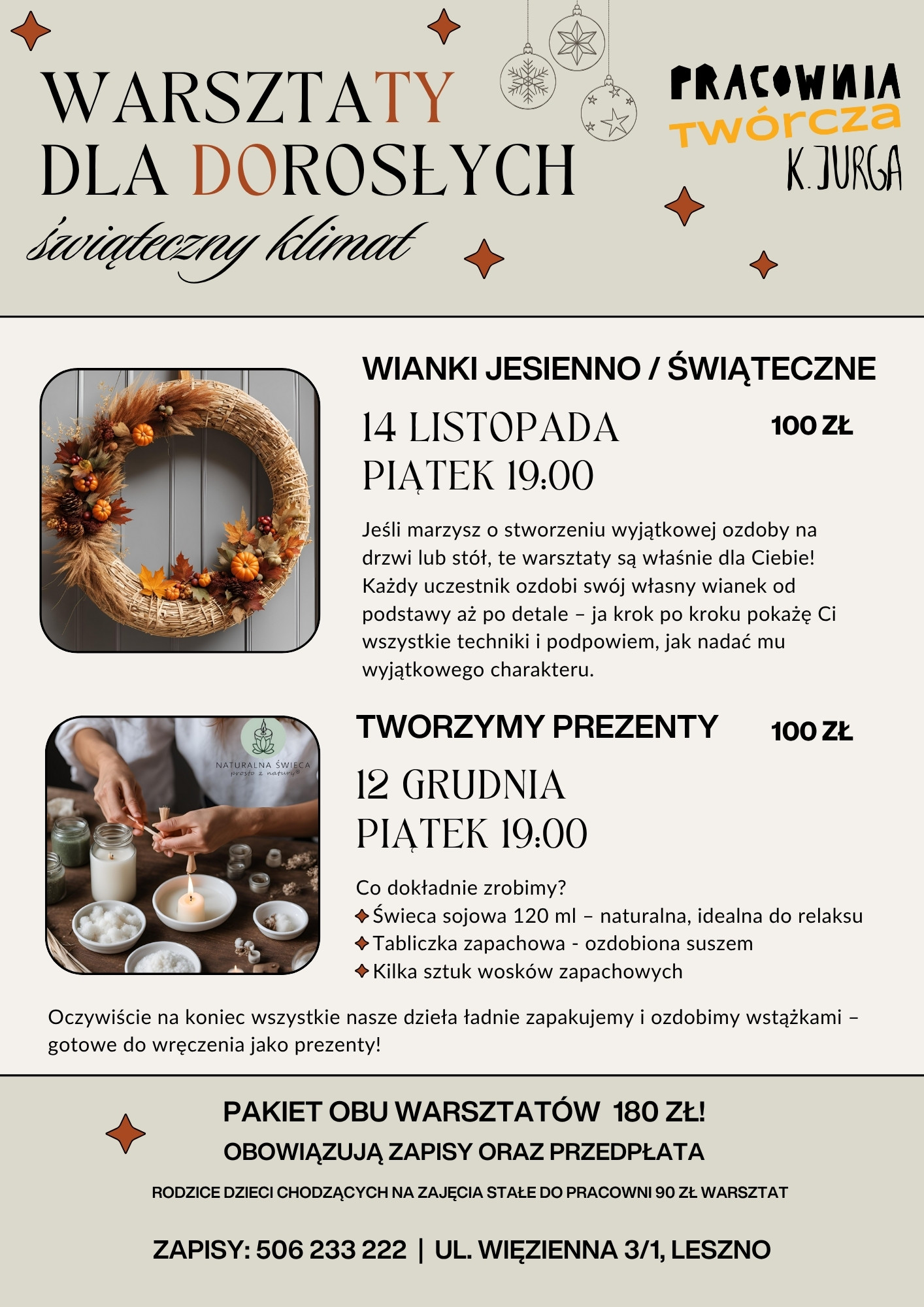 Miejscowość: Leszno Miejsce: ul. Więzienna 3/1 Data rozpoczęcia: 14.11.2025 19:00:00 Data zakończenia: 14.11.2025 21:00:00 Organizator: Pracownia Twórcza Opis wydarzenia: Warsztaty Wianków Jesienno / Świątecznych - warsztaty dla dorosłych Zapraszam Cię na wyjątkowe warsztaty w Lesznie, podczas których własnoręcznie udekorujesz gotową bazę wianka naturalnymi roślinami i dodatkami. Do wyboru: Jesienny wianek – ciepłe barwy, owoce, susze i klimaty jesieni. Zimowy wianek – pachnący igliwiem, przyprawami, cytrusami. Możesz też połączyć obie wersje i stworzyć unikalną kompozycję, która zostanie z Tobą na długo. Każdy uczestnik ozdobi swój własny wianek od podstawy aż po detale – ja krok po kroku pokażę Ci wszystkie techniki i podpowiem, jak nadać mu wyjątkowego charakteru. Efekt? Dekoracja na drzwi, stół lub komodę, która będzie piękna przez wiele miesięcy. Nie martw się, jeśli to Twój pierwszy raz – jestem tu, żeby Ci pomóc na każdym kroku! Wspólnie stworzymy coś pięknego, co wniesie do Twojego domu magię świąt. Nie czekaj, dołącz do nas i stwórz swój niepowtarzalny wianek! Warsztaty prowadzi: Aleksandra Wiecka - Naturalna Świeca Zapisy: 506 233 222 ul. Więzienna 3/1, Leszno Obowiązuje przedpłata Inwestycja: 100 zł Rodzice dzieci chodzących na zajęcia stałe do pracowni 90 zł Chcesz zrobić prezent? Zapytaj o voucher! Zapraszamy też na grudniowe warsztaty zapachowe: https://www.facebook.com/events/716707394810442 |