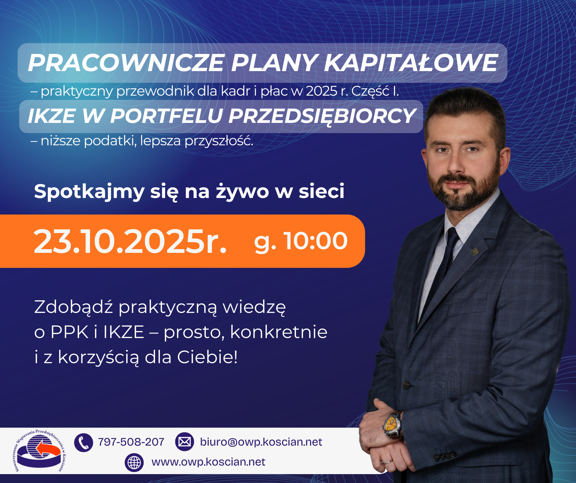 Miejscowość: Kościan Miejsce: online na platformie MS Teams Data rozpoczęcia: 23.10.2025 10:00:00 Data zakończenia: 23.10.2025 11:30:00 Organizator: Stowarzyszenie Wspierania Przedsiębiorczości w Kościanie Opis wydarzenia: Stowarzyszenie Wspierania Przedsiębiorczości w Kościanie serdecznie zaprasza na praktyczne spotkanie online, podczas którego poruszone zostaną najważniejsze zagadnienia związane z Pracowniczymi Planami Kapitałowymi (PPK) oraz Indywidualnym Kontem Zabezpieczenia Emerytalnego (IKZE). Część I – PPK w pytaniach i odpowiedziach – przewodnik dla kadr i płac w 2025 r. • Obowiązki pracodawcy w 2025 roku, • Rozliczenia i zmiany prawne, • Dobre praktyki z działów HR, • Praktyczna formuła Q&A. Część II – IKZE w portfelu przedsiębiorcy – niższe podatki, lepsza przyszłość • Jak działa Indywidualne Konto Zabezpieczenia Emerytalnego? • Jak je wykorzystać do legalnej optymalizacji podatkowej? • Jak budować bezpieczną przyszłość finansową? Prowadzący: Mateusz Kozłowski - Ekspert Instytucji Finansowej ds. PPK, PPE, IKE, IKZE oraz inwestycji finansowych. Udział w spotkaniu jest całkowicie bezpłatny! Aby wziąć udział, wystarczy zapisać się do 22.10.2025 r. przez formularz zgłoszeniowy. Więcej informacji na stronie: www.owp.koscian.net lub dzwoniąc pod numer 797 508 207. Zapraszamy! |