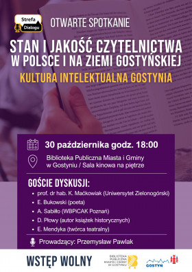 Miejscowość: Gostyń Miejsce: Biblioteka Publiczna Miasta i Gminy w Gostyniu, ul. Wrocławska 257, 63-800 Gostyń Data rozpoczęcia: 30.10.2025 18:00:00 Data zakończenia: 30.10.2025 20:00:00 Organizator: Biblioteka Publiczna Miasta i Gminy w Gostyniu Opis wydarzenia: Druga odsłona Strefy Dialogu! Tym razem o czytelnictwie i kulturze intelektualnej Gostynia! Po wielkim sukcesie, jakim było spotkanie na temat obronności, Strefa Dialogu zaprasza do gostyńskiej biblioteki na debatę o czytaniu i inteligencji. Już 30 października o godz. 18.00 tematem rozmowy będzie „Stan i jakość czytelnictwa w Polsce i na ziemi gostyńskiej. Kultura intelektualna Gostynia”. Wspólnie przyjrzymy się, jak wygląda czytelnictwo w Gostyniu i okolicy. Ile osób korzysta z biblioteki, własnych księgozbiorów, pożycza w drugim obiegu? Jak to wygląda w porównaniu do Wielkopolski i całego kraju? Jakie książki są czytane najczęściej? Po co ludzie czytają książki? Jak wygląda struktura społeczna czytelników? Czy w Gostyniu jest kultura intelektualna i jak ją zdefiniować? Jakie są jej przejawy? Czy warto wspierać kulturę wysoką? Co zrobić, by poprawić ilość i jakość czytelnictwa? Goście: Prof. dr hab. K. Maćkowiak (językoznawca, Instytut Filologii Polskiej Uniwersytetu Zielonogórskiego, Przewodniczący Rady Programowej Rocznika Gostyńskiego) E. Bukowski (gostyński poeta młodego pokolenia, autor tomiku „Wyniesiony”) A. Sabiłło (starszy kustosz, zastępca kierowniczki Działu Metodyki, Analiz i Współpracy z Bibliotekami w Wojewódzkiej Bibliotece Publicznej i Centrum Animacji Kultury w Poznaniu) D. Płowy (autor książek z historii wojskowości, pracownik Biblioteki Publicznej Miasta i Gminy w Pogorzeli) E. Mendyka (reżyserka i scenarzystka teatralna, nauczycielka języka polskiego w Liceum Ogólnokształcącym w Gostyniu i wykładowczyni w Collegium da Vinci w Poznaniu). Prowadzący: Przemysław Pawlak Wstęp wolny! Przyjdź i zabierz głos! |