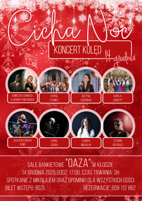 Miejscowość: Kłoda Miejsce: Oaza Sale Bankietowe Data rozpoczęcia: 22.10.2025 21:30:00 Data zakończenia: 14.12.2025 17:00:00 Organizator: Oaza Sale Bankietowe Opis wydarzenia: WYDARZENIE ŚWIĄTECZNE – NIE MOŻESZ TEGO PRZEGAPIĆ! Już 14 grudnia 2025 o godz. 17:00 w Oaza Sale Bankietowe w Kłodzie odbędzie się niezwykły koncert kolęd „Cicha Noc” – wydarzenie, które przeniesie Was w magiczny klimat Świąt Bożego Narodzenia. Na scenie zobaczymy utalentowanych lokalnych artystów, a także uczestników i finalistów takich programów jak Must Be The Music, X Factor, The Voice Kids, Dzień Dobry TVN. Nie zabraknie również góralskich klimatów, które dodadzą temu wieczorowi niepowtarzalnego uroku! Co Was czeka? 120 minut najpiękniejszych kolęd w wyjątkowych aranżacjach Spotkanie z Mikołajem dla najmłodszych Upominek dla każdego gościa Magiczna, świąteczna atmosfera, którą poczujecie od pierwszej chwili Bilety: 80 zł/osoba Liczba miejsc ściśle ograniczona! Zakup biletów: w biurze Oaza Sale Bankietowe Kłoda 5a (8:00–17:00) Rezerwacja biletów: 609-112-862 |