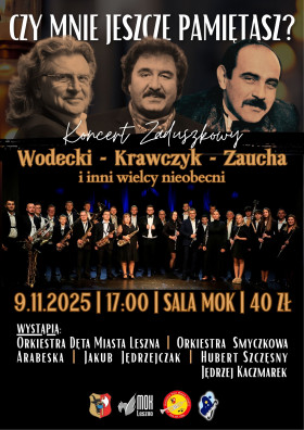 | Miejscowość: Leszno Miejsce: Miejski Ośrodek Kultury Data rozpoczęcia: 09.11.2025 17:00:00 Data zakończenia: 09.11.2025 19:00:00 Organizator: MOK Leszno Opis wydarzenia: "Czy mnie jeszcze pamiętasz?". Koncert zaduszkowy Koncert pamięci wybitnych artystów – 9 listopada 2025 r., godz. 17:00 Zapraszamy na wyjątkowy koncert poświęcony pamięci nieżyjących legend polskiej sceny muzycznej – Zbigniewa Wodeckiego, Andrzeja Zauchy, Krzysztofa Krawczyka i innych. W programie koncertu usłyszymy najpiękniejsze utwory tych niezapomnianych artystów w nowych poruszających aranżacjach. Wystąpią: Orkiestra Dęta Miasta Leszna, Orkiestra Smyczkowa z Państwowej Szkoły Muzycznej w Lesznie, Zespół Arabeska, a także soliści: Jakub Jędrzejczak, Hubert Szczęsny, Jędrzej Kaczmarek. Wzruszająca muzyczna podróż, która na nowo przywoła wspomnienia i emocje… Informacje organizacyjne: Data: 9 listopada 2025 r. (niedziela) Godzina: 17:00 Miejsce: Sala widowiskowa Miejskiego Ośrodka Kultury w Lesznie, ul. Bolesława Chrobrego 3a. Bilety: w cenie 40 zł do nabycia w Kasie MOK, ul. Bolesława Chrobrego 4 w Lesznie, od poniedziałku do piątku w godz. 10-18. |