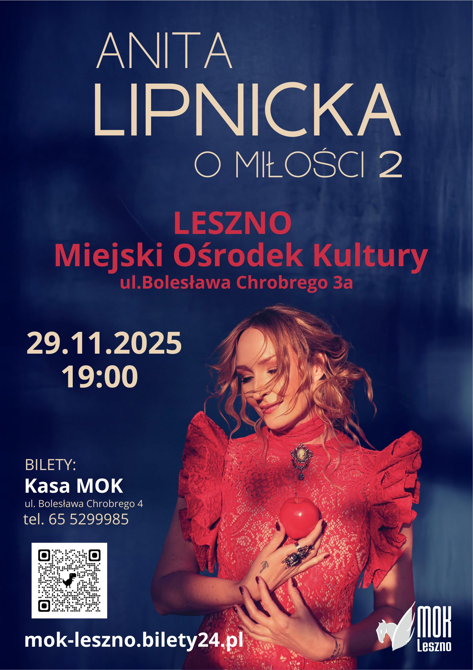 | Miejscowość: Leszno Miejsce: Miejski Ośrodek Kultury Data rozpoczęcia: 29.11.2025 19:00:00 Data zakończenia: 29.11.2025 21:00:00 Organizator: MOK Leszno Opis wydarzenia: 29 listopada 2025 r. zobaczymy Anitę Lipnicką w Miejskim Ośrodku Kultury w Lesznie w niezwykłym projekcie scenicznym zatytułowanym "O miłości 2". Jest on kontynuacją koncertów, z którymi artystka przemierzała Polskę w 2023 i 2024 roku. Anita Lipnicka jest artystką, która zdążyła przyzwyczaić nas do tego, że jej koncerty to nie tylko wydarzenia muzyczne na najwyższym poziomie, ale przede wszystkim bliskie, pełne wzruszeń spotkania. Nikt jak ona nie skraca tak skutecznie dystansu między sceną, a widownią, nikt nie snuje tylu osobistych opowieści, które tak głęboko rezonują z publicznością. Przekonali się o tym ci, którzy mieli okazję zobaczyć piosenkarkę m.in. w jej ostatniej trasie promującej płytę "Śnienie", czy też w duecie z Johnem Porterem podczas ich niedawnej, jubileuszowej kolaboracji. Tymczasem już tej jesieni będzie można oglądać Anitę w nowym, niezwykłym projekcie scenicznym zatytułowanym "O miłości 2". Jest on kontynuację trasy, w jaką artystka ruszyła jesienią 2022 i którą zakończyła wiosną 2023 roku, odwiedzając blisko 50 miast Polski. “Nasze miłosne koncerty cieszyły się takim powodzeniem, że ja i mój zespół postanowiliśmy stworzyć drugą edycję tego wydarzenia. Podobnie jak poprzednio, kluczem w doborze repertuaru było dla nas słowo "miłość" - wszystkie jej kolory, etapy, odsłony... A, że sama w życiu sporo się już nakochałam, nie brakuje w moim twórczym dorobku utworów o tej tematyce” - wyjaśnia Anita.“ W odróżnieniu do poprzedniej trasy, podczas której jako dopełnienie narracji posłużyły nam covery zagranicznych miłosnych evergreenów, tym razem wzięliśmy na warsztat piosenki polskich artystów, którzy byli dla mnie osobistą inspiracją, kiedy byłam młodą dziewczyną. Wrócimy więc do muzyki przełomu lat 80' i 90' - może się zdarzyć, że łzy będą się lać ciurkiem. Zabierzcie ze sobą chusteczki i najlepiej jeszcze kogoś do przytulenia!” - żartuje artystka. Oprócz wrażeń słuchowych, Anita zapewnia także swoich słuchaczy, że nie ominą ich te wzrokowe - "Jak zwykle, zabieramy ze sobą bajeczną scenografię, dedykowaną trasie "O miłości 2", która mam nadzieję wprowadzi Was w stan miłosnego uniesienia i nie pozwoli Wam długo o nas zapomnieć...". Anita Lipnicka - wokal Piotr Świętoniowski - instrumenty klawiszowe Bartek Miarka - gitary Kamil Pełka - kontrabas Łukasz Sobolak - perkusja Mateusz Sołtysik - realizacja dźwięku Piotr Mrowiec - realizacja światła Paweł Talaga - scenografia, kostiumy Uwaga: w trakcie trwania koncertów palone są kadzidła o zapachu stworzonym na tę okazję przez Anitę. Kadziła umieszczone są zazwyczaj na scenie oraz przy stanowiskach realizatorskich. INFORMACJE ORGANIZACYJNE: Miejsce: Sala Miejskiego Ośrodka Kultury, Leszno Data: 29 listopada 2025, godz. 19:00 Bilety: Kasa MOK, ul. Bolesława Chrobrego 4, Leszno, od poniedziałku do piątku w godz. 10-18;online: www.mok-leszno.bilety24.pl |