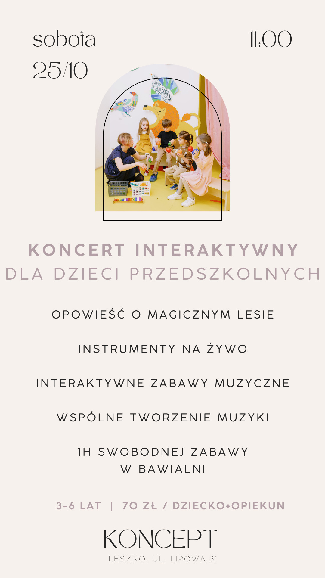 | Miejscowość: Leszno Miejsce: KONCEPT (Leszno, ul. Lipowa 31) Data rozpoczęcia: 25.10.2025 11:00:00 Data zakończenia: 25.10.2025 12:00:00 Organizator: kawiarnia & bawialnia KONCEPT Opis wydarzenia: Zapraszamy na kolejny koncert interaktywny z instrumentami NA ŻYWO, gdzie dzieci są aktorami! Nasze interaktywne koncerty to połączenie magii, teatru i muzyki, gdzie głównymi aktorami są dzieci. Wspólnie z profesjonalnymi muzykami, dzieci stworzą muzykę, chór, harmonię, ruch, muzyczne rysunki i inne szalone wariacje! Każdego miesiąca przygotowujemy nową muzyczną przygodę, która wciągnie dzieci w świat dźwięków i kreatywności. W programie: - Różnorodność instrumentów: dęte, strunowe, klawiszowe, perkusyjne, etniczne. - Poznawanie brzmień: Instrumenty ludowe, historyczne, symfoniczne, spirytualne. - Interaktywne zabawy muzyczne – zabawy teatralne, muzyczne, plastyczne, taneczne, sensoryczne Co miesiąc nowa muzyczna opowieść! "Magia Lasu" - Historia o Elfie i jego leśnym śnie. Pośpiewamy z leśnym strumieniem, drzewami , poznamy też skrzaty-wariaty. Opowieść zostanie zagrana między innymi na harfie, handpanie, misach kryształowych i instrumentach dźwiękonaśladowczych. Pojawią się aktywności rytmiczne, taneczne, teatr, chór i masa dźwiękowej zabawy! CENA: 70 zł / parę (dziecko + opiekun) Bilet obowiązuje na każde dziecko biorące udział w wydarzeniu. W cenie wliczona jest również 1h swobodnej zabawy w bawialni. Na wydarzenie obowiązują zapisy! Szczegóły na Facebooku @konceptleszno. |