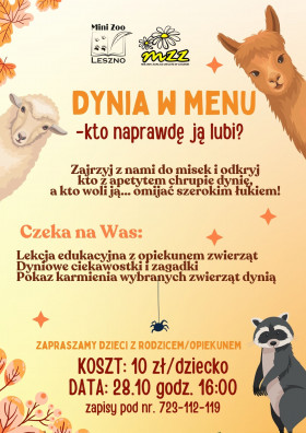 | Miejscowość: Leszno Miejsce: Mini ZOO Leszno Data rozpoczęcia: 28.10.2025 16:00:00 Data zakończenia: 28.10.2025 17:00:00 Organizator: Mini ZOO Leszno Opis wydarzenia: Serdecznie zapraszamy do Mini ZOO na wyjątkowe spotkanie! Czeka na Was: -lekcja edukacyjna z opiekunem zwierząt -dyniowe ciekawostki i zagadki -pokaz karmienia wybranych zwierząt dynią |