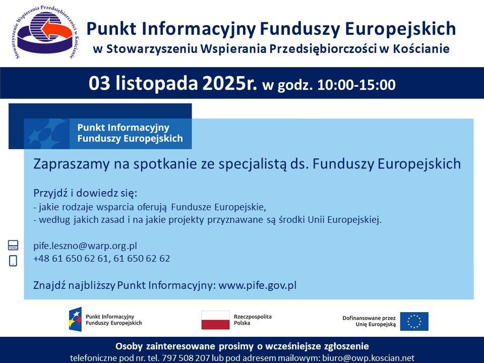 | Miejscowość: Kościan Miejsce: Ośrodek Wspierania Przedsiębiorczości w Kościanie, ul. Dworcowa 1 Data rozpoczęcia: 03.11.2025 10:00:00 Data zakończenia: 03.11.2025 15:00:00 Organizator: Stowarzyszenie Wspierania Przedsiębiorczości w Kościanie Opis wydarzenia: Zapraszamy przedsiębiorców, osoby fizyczne, organizacje pozarządowe i inne podmioty szukające dofinansowania. |