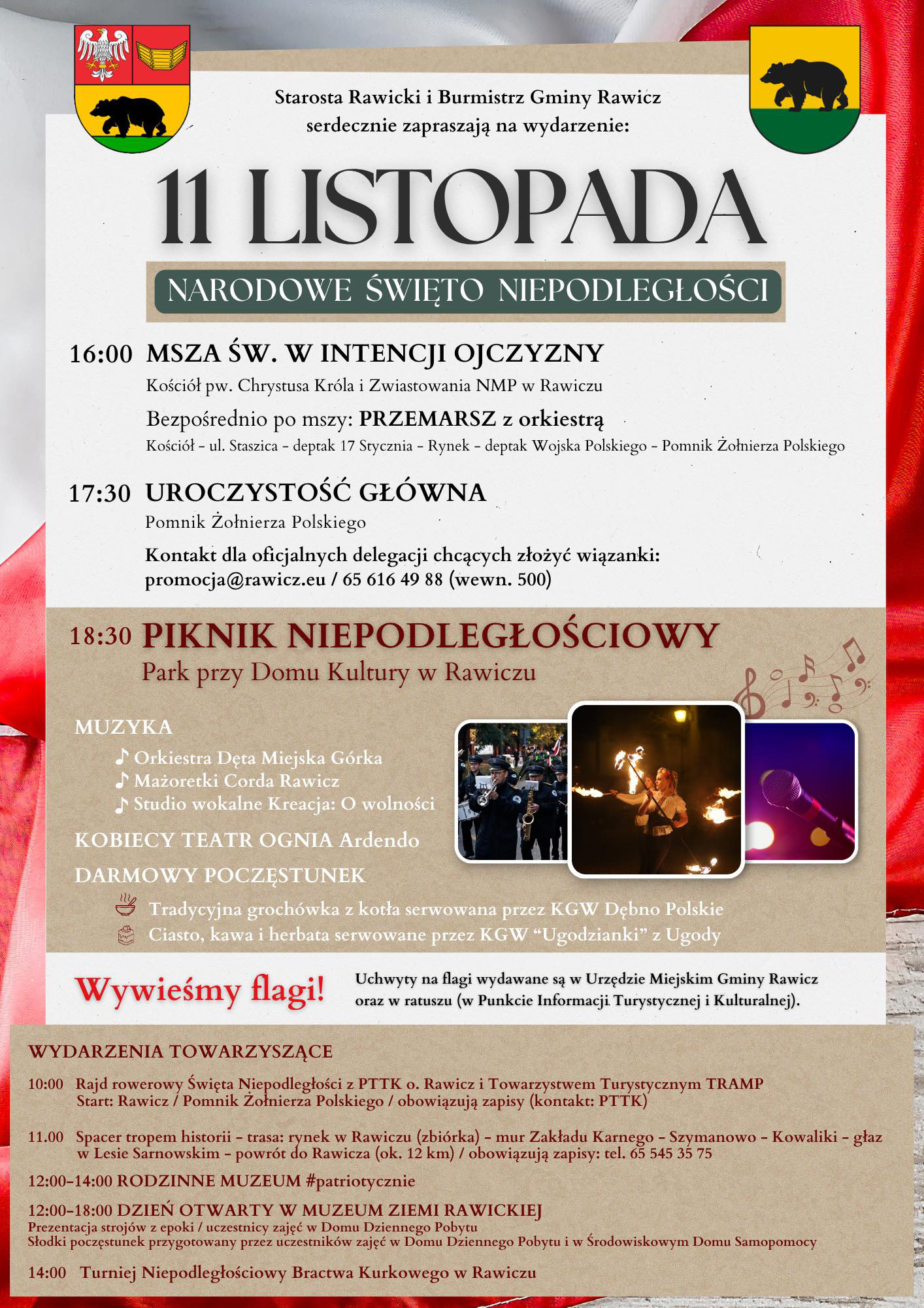 |   Miejscowość: Rawicz Miejsce: Kościół p.w.Chrystusa Króla i Zwiastowania NMP w Rawiczu, Pomnik Żołnierza Polskiego, Park przy Domu Kultury w Rawiczu Data rozpoczęcia: 11.11.2025 16:00:00 Data zakończenia: 11.11.2025 21:00:00 Organizator: UMGR Biuro Promocji i Komunikacji Społecznej. Opis wydarzenia: Oficjalne uroczystości odbędą się w Kościele p.w.Chrystusa Króla i Zwiastowania NMP w Rawiczu oraz przy Pomniku Żołnierza Polskiego. Po uroczystości głównej zapraszamy do udziału w Pikniku Niepodległościowym, który odbędzie się w Parku przy Domu Kultury w Rawiczu. |