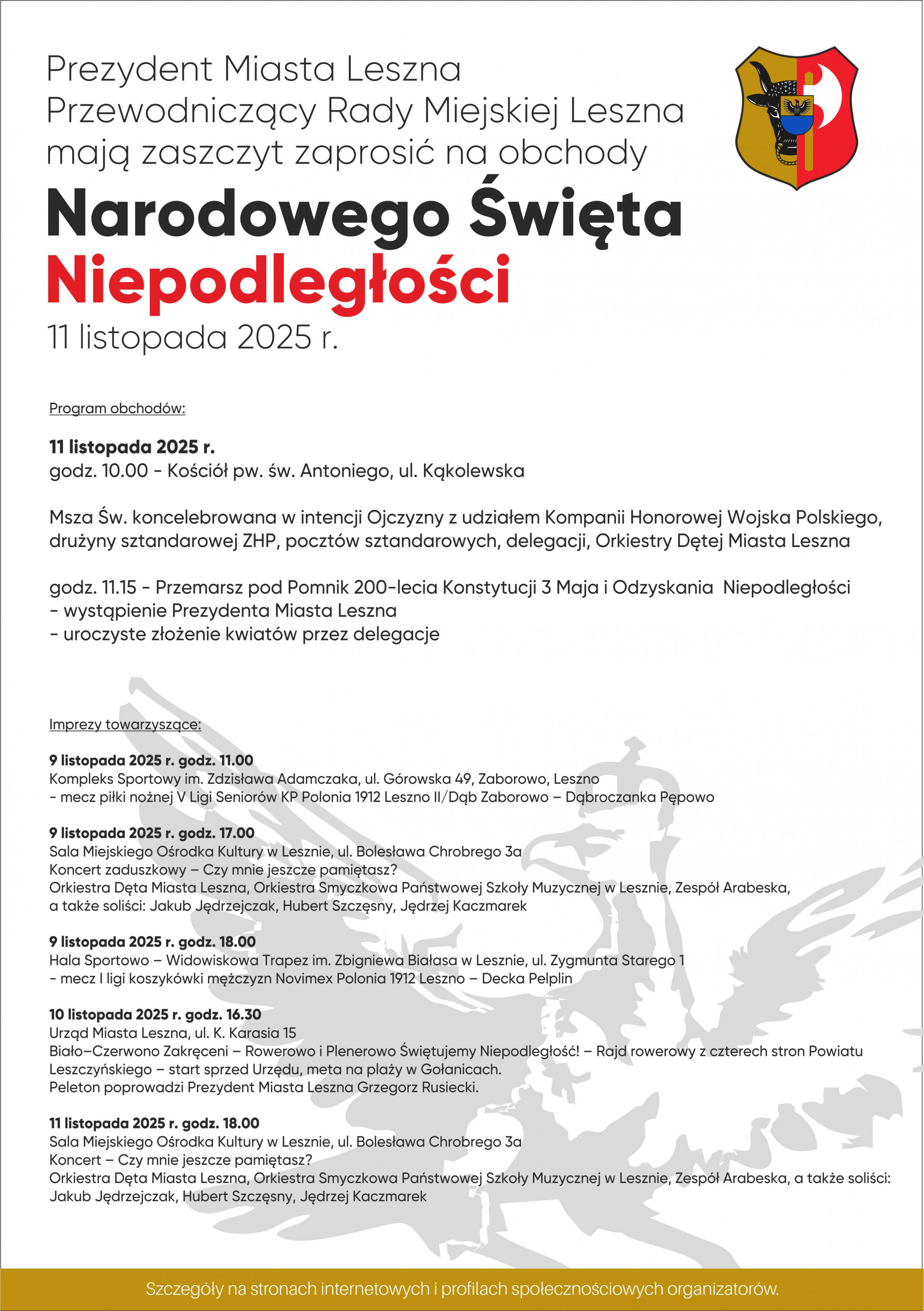 | Miejscowość: Leszno Miejsce: całe miasto Data rozpoczęcia: 09.11.2025 11:00:00 Data zakończenia: 11.11.2025 20:00:00 Organizator: Miasto Leszno Opis wydarzenia: Prezydent Miasta Leszna i Przewodniczący Rady Miejskiej Leszna zapraszają na uroczyste obchody Narodowego Święta Niepodległości. Program obchodów 11 listopada przedstawia się następująco: godz. 10.00 – Kościół pw. św. Antoniego, ul. Kąkolewska; Msza Św. koncelebrowana w intencji Ojczyzny z udziałem kompanii honorowej wojska, drużyny sztandarowej ZHP, pocztów sztandarowych, delegacji, Orkiestry Dętej Miasta Leszna godz. 11.15 - Przemarsz pod Pomnik 200-Lecia Konstytucji 3 Maja i Odzyskania Niepodległości wystąpienie Prezydenta Miasta Leszna, uroczyste złożenie kwiatów przez delegacje. Imprezy towarzyszące: 9 listopada, godz.11.00 Mecz piłki nożnej V Ligi Seniorów KP Polonia 1912 Leszno II / Dąb Zaborowo - Dąbroczanka Pępowo Kompleks Sportowy im. Zdzisława Adamczaka, ul. Górowska 49, Zaborowo, Leszno 9 listopada, godz. 17.00 Koncert zaduszkowy "Czy mnie jeszcze pamiętasz?". Orkiestra Dęta Miasta Leszna, Orkiestra Smyczkowa Państwowej Szkoły Muzycznej I i II stopnia im. Romana Maciejewskiego w Lesznie, Zespół Arabeska, a także soliści: Jakub Jędrzejczak, Hubert Szczęsny, Jędrzej Kaczmarek. Sala Miejskiego Ośrodka Kultury, ul. Bolesława Chrobrego 3a, Leszno 9 listopada, godz. 18.00 Mecz I ligi koszykówki mężczyzn Novimex Polonia 1912 Leszno - Decka Pelpin Hala Sportowo-Widowiskowa im. Zbigniewa Białasa, ul. Zygmunta Starego 1, Leszno 10 listopada, godz. 16.30 Biało-Czerwono Zakręceni - Rowerowo i Plenerowo Świętujemy Niepodległość, Raj Rowerowy z 4 stron Powiatu Leszczyńskiego. Start sprzed urzędu, meta na plaży w Gołanicach. Peleton poprowadzi Prezydent Miasta Leszna Grzegorz Rusiecki Urząd Miasta Leszna, ul. Kazimierza Karasia 15, Leszno. 11 listopada, godz. 18.00 Koncert "Czy mnie jeszcze pamiętasz?". Orkiestra Dęta Miasta Leszna, Orkiestra Smyczkowa Państwowej Szkoły Muzycznej I i II stopnia im. Romana Maciejewskiego w Lesznie, Zespół Arabeska, a także soliści: Jakub Jędrzejczak, Hubert Szczęsny, Jędrzej Kaczmarek. Sala Miejskiego Ośrodka Kultury, ul. Bolesława Chrobrego 3a, Leszno |
