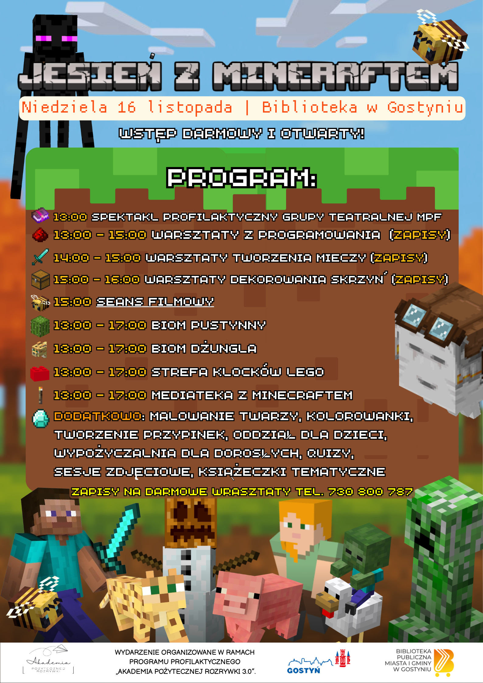 | Miejscowość: Gostyń Miejsce: Biblioteka w Gostyniu Data rozpoczęcia: 16.11.2025 13:00:00 Data zakończenia: 16.11.2025 17:00:00 Organizator: Biblioteka Publiczna Miasta i Gminy w Gostyniu Opis wydarzenia: Zapraszamy na wyjątkową niedzielę pełną zabawy, kreatywności i edukacji! Przed nami kolorowe, klockowe światy, wspólne budowanie, eksperymentowanie i twórcze warsztaty inspirowane grami typu Minecraft. To otwarte i bezpłatne wydarzenie dla całych rodzin – idealne, by połączyć naukę z dobrą zabawą. Program: 13:00 – spektakl profilaktyczny grupy teatralnej MPF 13:00–15:00 – warsztaty z programowania (zapisy) (liczba miejsc ograniczona!) 14:00–15:00 – warsztaty tworzenia mieczy (zapisy) (liczba miejsc ograniczona!) 15:00–16:00 – warsztaty dekorowania skrzyń (zapisy) (liczba miejsc ograniczona!) 15:00 – seans filmowy 13:00–17:00 – biom pustynny 13:00–17:00 – biom dżungla 13:00–17:00 – strefa klocków LEGO 13:00–17:00 – Mediateka tematyczna Dodatkowe atrakcje: malowanie twarzy, kolorowanki, tworzenie przypinek, quizy, sesja zdjęciowa, książeczki tematyczne oraz Oddział dla Dzieci i Wypożyczalnia dla Dorosłych. Zapisy na darmowe warsztaty: 730 800 787 Wydarzenie organizowane jest w ramach programu profilaktycznego „Akademia Pożytecznej Rozrywki 3.0”. |