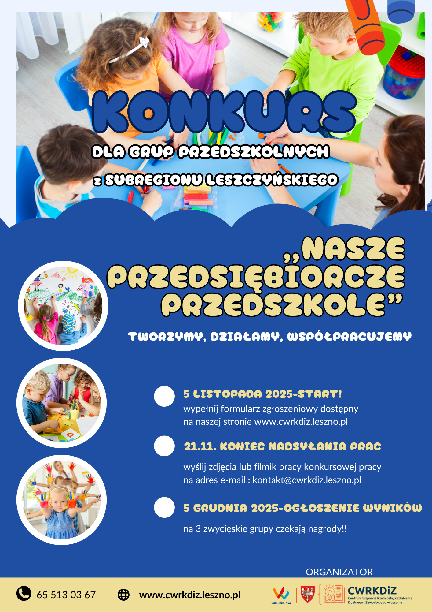 | Miejscowość: Leszno Miejsce: Śniadeckich 5 Data rozpoczęcia: 06.11.2025 00:00:00 Data zakończenia: 21.11.2025 00:00:00 Organizator: Centrum Wsparcia Rzemiosła, Kształcenia Dualnego i Zawodowego w Lesznie Opis wydarzenia: Z okazji Światowego Tygodnia Przedsiębiorczości 2025, który odbywa się pod hasłem „Razem budujemy przedsiębiorczość”, Centrum Wsparcia Rzemiosła, Kształcenia Dualnego i Zawodowego w Lesznie zaprasza wszystkie grupy przedszkolne z subregionu leszczyńskiego do udziału w konkursie „Nasze Przedsiębiorcze Przedszkole”. Dlaczego warto wziąć udział? Konkurs to wyjątkowa okazja, aby dzieci: • rozwijały kreatywność i pomysłowość, • uczyły się współpracy i wspólnego działania, • poznawały podstawy przedsiębiorczości w praktyce, • doskonaliły umiejętności komunikacyjne, • doświadczały radości ze wspólnego osiągania celu. Co trzeba zrobić? 1. Wymyślcie wspólny projekt, pokazujący, jak dzieci mogą działać razem i pomagać innym – np. przedszkolna piekarnia dobroci, fabryka marzeń, miasteczko współpracy czy stacja pomagania. 2. Stwórzcie pracę konkursową w przedszkolu – plakat, kolaż lub makietę – tak, aby każde dziecko miało swój wkład. 3. Do nas przesyłacie wyłącznie dokumentację pracy, a nie samą wykonaną pracę. Dokumentacja powinna zawierać: o 1 zdjęcie gotowej pracy, o maksymalnie 10 zdjęć pokazujących dzieci podczas tworzenia pracy, o opcjonalnie krótki filmik (do 1 minuty) pokazujący współpracę dzieci, o krótki opis pracy (do 10 zdań), zawierający tytuł pracy, krótki opis pomysłu, sposób współpracy dzieci oraz wnioski dotyczące przedsiębiorczości, o zeskanowaną, podpisaną zgodę nauczyciela/opiekuna grupy na udział w konkursie, publikację zdjęć i filmów oraz danych przedszkola, zgodnie ze wzorem określonym w Załączniku nr 2 regulaminu. Terminy • Start konkursu: 5 listopada 2025 r. • Zgłoszenia online: do 14 listopada 2025 r. • Nadsyłanie dokumentacji prac: do 21 listopada 2025 r. • Ocena prac przez komisję: 24–28 listopada 2025 r. • Ogłoszenie wyników i publikacja wyników: do 5 grudnia 2025 r. Nagrody i wyróżnienia • Tytuł „Najbardziej Przedsiębiorczej Grupy Przedszkolnej 2025” oraz zestaw edukacyjny dla całej grupy. • Wyróżnienia dla grup: Mistrzowie Współpracy i Twórcy Dobrych Pomysłów, również z nagrodami edukacyjnymi. • Dyplomy elektroniczne dla wszystkich uczestników. Jak zgłosić udział? Wystarczy wypełnić formularz online i przesłać pełną dokumentację pracy wraz z podpisaną zgodą nauczyciela/opiekuna. Wszystkie dokumenty, szczegóły oraz regulamin znajdziesz pod linkiem: https://cwrkdiz.leszno.pl/konkurs-dla-przedszkoli-nasze-przedsi%C4%99biorcze-przedszkole Pamiętajmy – wspólna zabawa i współpraca rozwijają kreatywność i przedsiębiorczość! Małe pomysły, wielkie możliwości! |