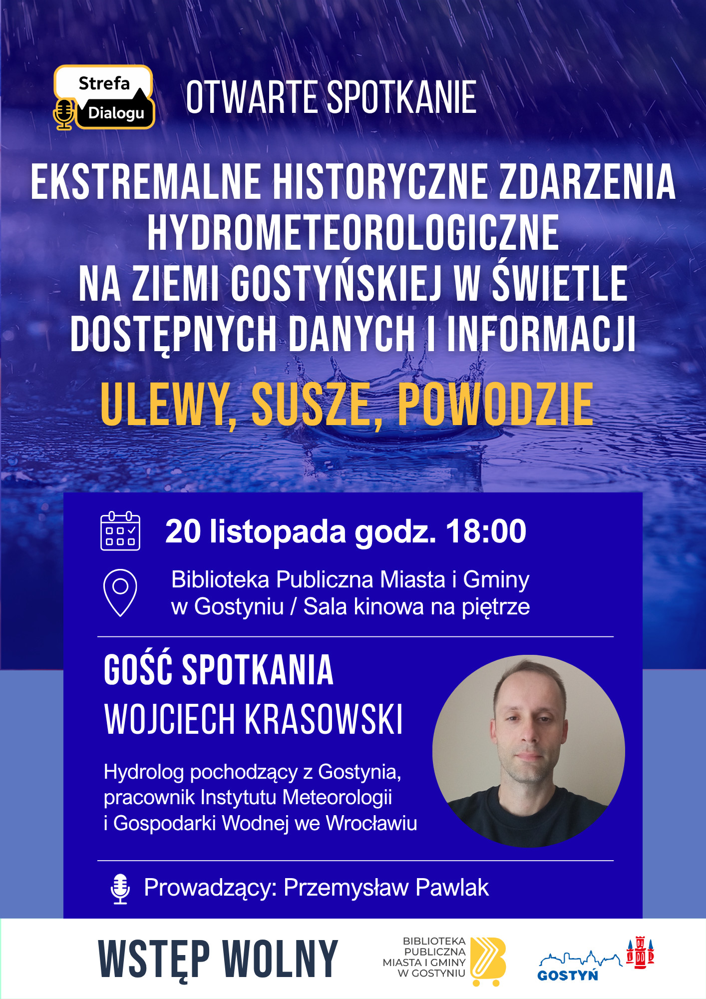 | Miejscowość: Gostyń Miejsce: Biblioteka w Gostyniu Data rozpoczęcia: 20.11.2025 18:00:00 Data zakończenia: 20.11.2025 20:00:00 Organizator: Biblioteka Publiczna Miasta i Gminy w Gostyniu Opis wydarzenia: Już 20 listopada o godz. 18.00 w Bibliotece Publicznej Miasta i Gminy w Gostyniu odbędzie się kolejne spotkanie z cyklu „Strefa Dialogu”. Tym razem gościem będzie Wojciech Krasowski pochodzący z Gostynia hydrolog, pracujący w IMGW we Wrocławiu, który wygłosi prelekcję pt. „Ekstremalne historyczne zdarzenia hydrometeorologiczne (ulewy, susze, powodzie) na ziemi gostyńskiej w świetle dostępnych danych i informacji”. Wojciech Krasowski, urodzony w Gostyniu, absolwent geografii (hydrologia, meteorologia, klimatologia) na Wydziale Nauk Geograficznych i Geologicznych UAM w Poznaniu oraz GIS na Wydziale Geoinżynierii, Górnictwa i Geologii Politechniki Wrocławskiej, pracownik i doktorant w Instytucie Meteorologii i Gospodarki Wodnej - Państwowym Instytucie Badawczym we Wrocławiu, hydrolog - specjalista w zakresie wód płynących, powodzi i suszy, zajmujący się przygotowywaniem opracowań hydrologiczno-historycznych, opinii, analiz i ekspertyz, synoptyk Biura Prognoz Hydrologicznych we Wrocławiu odpowiedzialny za osłonę hydrologiczną (w tym powodziową) dorzecza górnej i środkowej Odry, uczestnik konferencji naukowo-badawczych, wykonawca, współwykonawca lub kierownik projektów rozwojowych, badawczych krajowych i międzynarodowych, autor lub współautor artykułów i monografii z zakresu hydrologii, a także bloga nt. hydrologii małych zlewni nizinnych, z zainteresowania hydrolog regionalny m.in. ziemi gostyńskiej, meteorolog. Po prelekcji odbędzie się dyskusja moderowana przez Przemysława Pawlaka. Zapraszamy wszystkich zainteresowanych uwarunkowaniami hydrologicznymi Gostynia, a także miłośników historii i regionalizmu do wysłuchania prelekcji i udziału w rozmowie. Wstęp wolny. Wstęp wolny! Przyjdź i zabierz głos! |