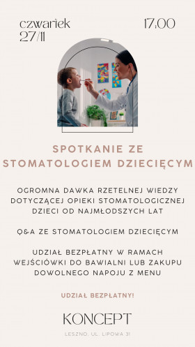 | Miejscowość: Leszno Miejsce: KONCEPT (Leszno, ul. Lipowa 31) Data rozpoczęcia: 27.11.2025 17:00:00 Data zakończenia: 27.11.2025 18:00:00 Organizator: kawiarnia & bawialnia KONCEPT Opis wydarzenia: Zęby to jeden z wielu tematów, który spędza sen z powiek rodzicom. Najpierw ząbkowanie i szerokie spektrum dolegliwości towarzyszących, później wypadanie mleczaków i zęby stałe. Po drodze próchnica, leczenie ortodontyczne, ubytki. - Kiedy wybrać się po raz pierwszy do stomatologa? - Jak to zrobić, aby dzieci szły na wizytę bez obaw i wychodziły z uśmiechem na twarzy? - Jak prawidłowo szczotkować zęby? - Jakie akcesoria i pasty wybrać? Pytań jest mnóstwo, a na wiele z nich odpowie Ewelina Nadol, założycielka Newdent Centrum Rozwoju Dziecka, stomatolog dziecięcy z pasji i powołania, a prywatnie mama trójki dzieci. To jedyne takie spotkanie w Lesznie, a liczba miejsc jest ograniczona. Dlatego warto skorzystać i zarezerwować sobie miejsce jak najszybciej. Udział w spotkaniu jest BEZPŁATNY. Wystarczy wykupić wejściówkę do bawialni dla dziecka (jeśli przyjdziecie razem), lub dowolny napój dostępny w menu (jeśli przyjedziesz bez dziecka). Aby wziąć udział w wydarzeniu wystarczy napisać do nas wiadomość na Facebooku lub Instagramie @konceptleszno |