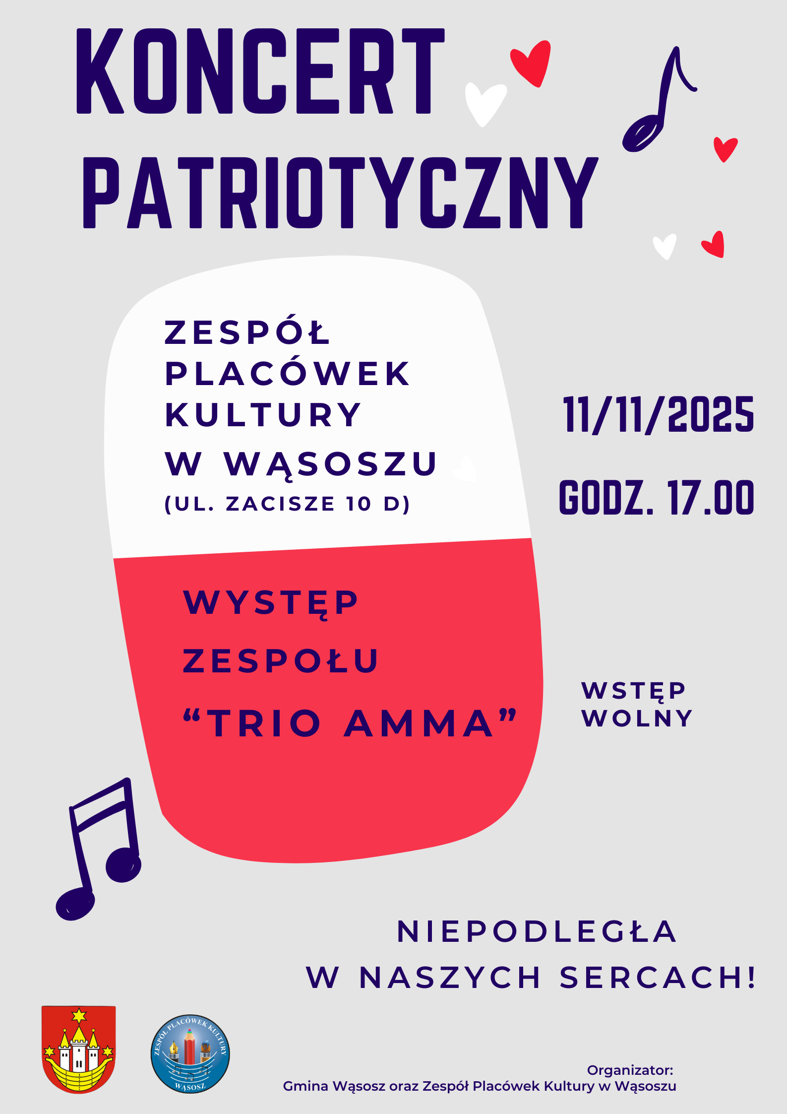 | Miejscowość: Wąsosz Miejsce: Zespół Placówek Kultury w Wąsoszu Data rozpoczęcia: 11.11.2025 17:00:00 Data zakończenia: 11.11.2025 18:00:00 Organizator: Gmina Wąsosz, Zespół Placówek Kultury w Wąsoszu Opis wydarzenia: KONCERT PATRIOTYCZNY Serdecznie zapraszamy na wyjątkowy koncert z okazji Narodowego Święta Niepodległości! 11 listopada 2025 r. (wtorek) godz. 17:00 Zespół Placówek Kultury w Wąsoszu, ul. Zacisze 10D Wystąpi zespół Trio Amma, który zabierze nas w muzyczną podróż pełną refleksji, emocji i patriotycznych brzmień. Wstęp wolny! Organizatorzy: Gmina Wąsosz Zespół Placówek Kultury w Wąsoszu |