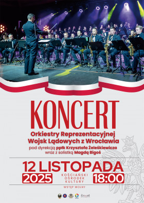 | Miejscowość: Kościan Miejsce: Sala widowiskowa Kościańskiego Ośrodka Kultury Data rozpoczęcia: 12.11.2025 18:00:00 Data zakończenia: 12.11.2025 19:00:00 Organizator: Kościański Ośrodek Kultury Opis wydarzenia: Z okazji Narodowego Święta Niepodległości zapraszamy do Kościańskiego Ośrodka Kultury na wydarzenie, które łączy historię z harmonią i intensywnością dźwięku. 12 listopada o godzinie 18:00 na naszej scenie zagości Orkiestra Reprezentacyjna Wojsk Lądowych z Wrocławia pod batutą ppłk Krzysztofa Żeleśkiewicza, której towarzyszyć będzie solistka Magdalena Bigoś. To wyjątkowa okazja, by w uroczystej i godnej atmosferze doświadczyć muzyki, która wyraża puls polskiej wolności i dumy. Niech ten koncert stanie się wspólnym, międzypokoleniowym spotkaniem w duchu wdzięczności i pamięci. Wstęp na to wydarzenie jest wolny. 12 listopada 2025 Godzina 18:00 sala widowiskowa KOK Serdecznie Państwa zapraszamy! |