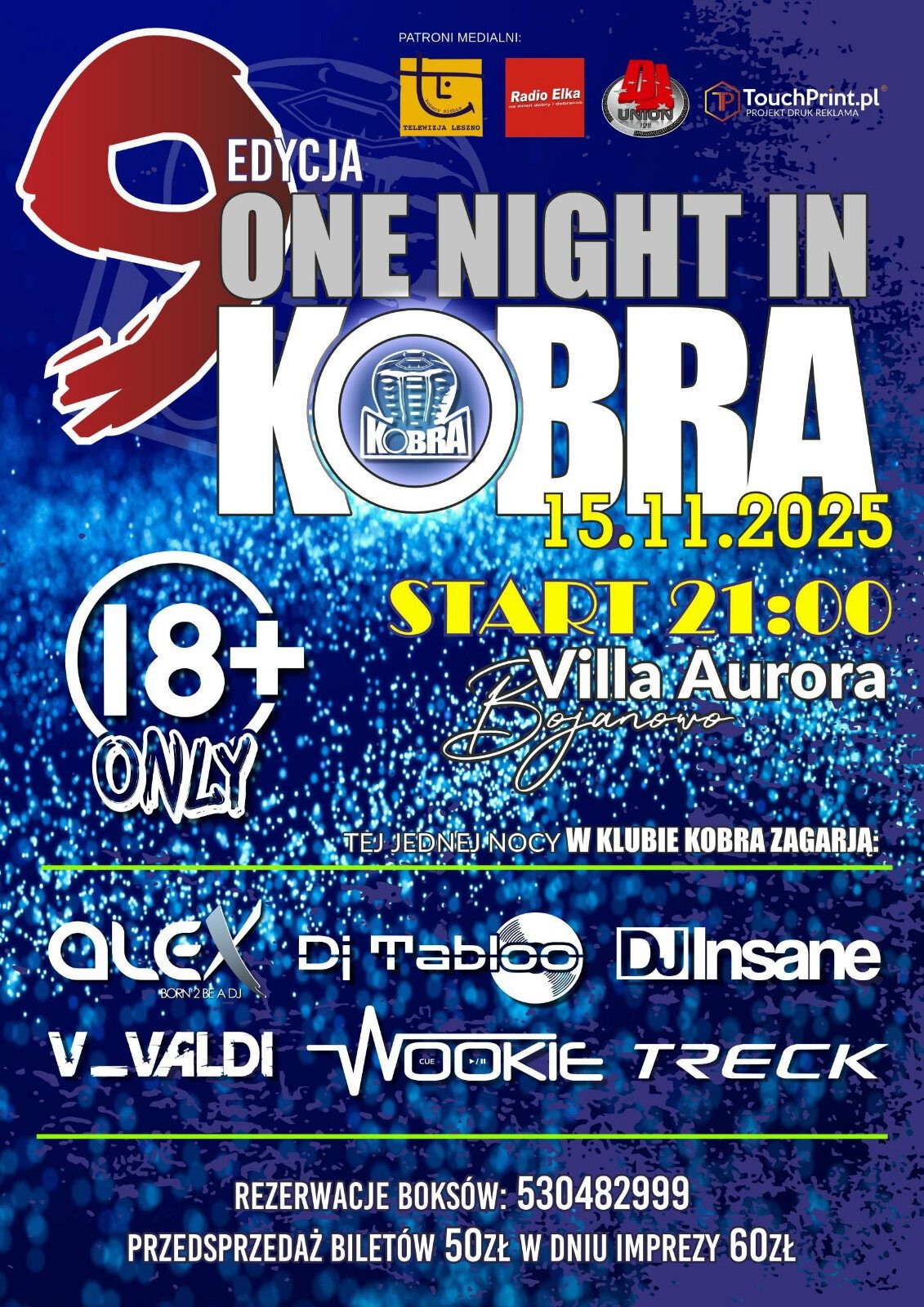 | Miejscowość: Bojanowo Miejsce: Villa Aurora Data rozpoczęcia: 15.11.2025 21:00:00 Data zakończenia: 16.11.2025 04:00:00 Organizator: Villa Aurora Opis wydarzenia: Chcesz się bawić dobrze? Baw się w Kobrze! Zapraszamy 15 listopada na 9 edycję imprezy. Startujemy o godz. 21.00. One Night in Kobra w Villi Aurora w Bojanowie zaprasza! |