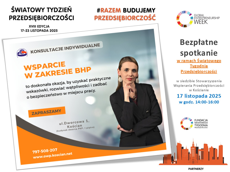 | Miejscowość: Kościan Miejsce: Ośrodek Wspierania Przedsiębiorczości w Kościanie, ul. Dworcowa 1 Data rozpoczęcia: 17.11.2025 14:00:00 Data zakończenia: 17.11.2025 16:00:00 Organizator: Stowarzyszenie Wspierania Przedsiębiorczości w Kościanie Opis wydarzenia: Zapraszamy przedsiębiorców oraz osoby planujące założenie działalności gospodarczej do skorzystania z bezpłatnych konsultacji w zakresie Bezpieczeństwa i Higieny Pracy (BHP). |