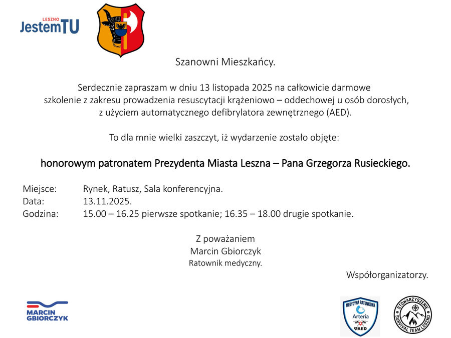 | Darmowe szkolenie z zakresu prowadzenia resuscytacji krążeniowo - oddechowej z użyciem AED |