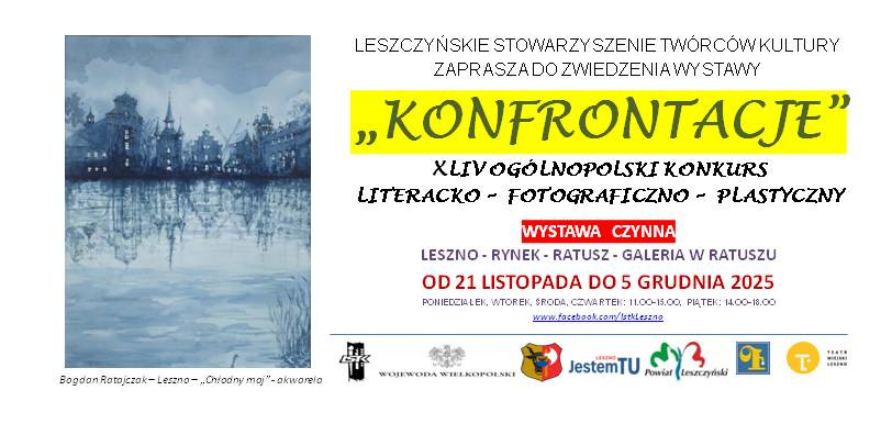| Miejscowość: LESZNO Miejsce: RYNEK - RATUSZ - GALERIA W RATUSZU Data rozpoczęcia: 24.11.2025 11:00:00 Data zakończenia: 05.12.2025 18:00:00 Organizator: LESZCZYŃSKIE STOWARZYSZENIE TWÓRCÓW KULTURY Opis wydarzenia: Konfrontacje”. To wyjątkowe wydarzenie od ponad czterech dekad stanowi ważny punkt na mapie kulturalnej Leszna i całej Polski, będąc przestrzenią do artystycznej wypowiedzi, wymiany myśli i, co najważniejsze, tytułowych konfrontacji – zarówno z własnymi ograniczeniami, jak i z dziełami innych twórców. Organizatorem konkursu, niezmiennie od początku jego istnienia, jest Leszczyńskie Stowarzyszenie Twórców Kultury (LSTK). Naszą misją jest wspieranie i promowanie talentów w trzech przenikających się dziedzinach: literaturze, fotografii i plastyce. Cieszymy się, że mimo upływu lat „Konfrontacje” wciąż przyciągają wiernych uczestników, a także inspirują nowe pokolenia artystów, o czym świadczy stale rosnąca liczba nadesłanych prac z najdalszych zakątków kraju. |