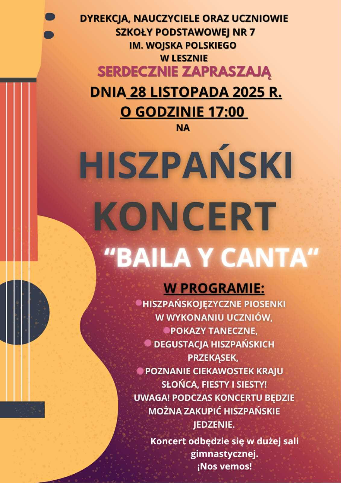 | Miejscowość: Leszno Miejsce: Szkoła Podstawowa nr 7 im. Wojska Polskiego (duża sala gimnastyczna) Data rozpoczęcia: 28.11.2025 17:00:00 Data zakończenia: 28.11.2025 19:00:00 Organizator: Dyrekcja, Nauczyciele oraz Uczniowie Opis wydarzenia: Dyrekcja,Nauczyciele oraz Uczniowie Szkoły Podstawowej nr 7 serdecznie zapraszają na hiszpański koncert "BAILA Y CANTA" W programie: * HISZPAŃSKOJĘZYCZNE PIOSENKI W WYKONANIU UCZNIÓW, * POKAZY TANECZNE, * DEAGUSTACJA HISZPAŃSKICH PRZEKĄSEK, * POZNANIE CIEKAWOSTEK KRAJU SŁOŃCA, FIESTY I SIESTY! UWAGA! Podczas koncertu będzie można zakupić HISZPAŃSKIE JEDZENIE Serdecznie zapraszamy! |