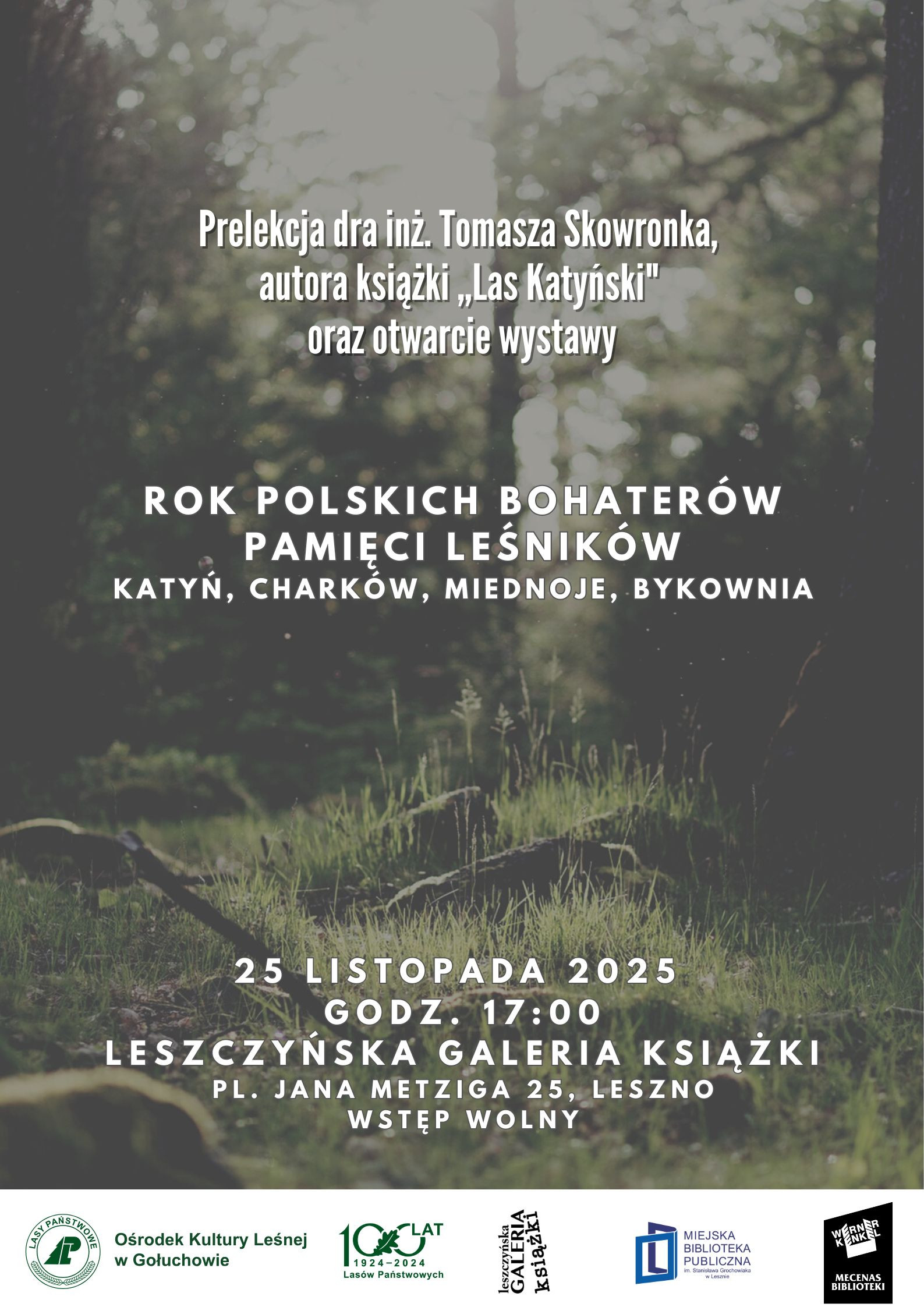 | Miejscowość: Leszno Miejsce: Leszczyńska Galeria Książki (pl. Jana Metziga 25) Data rozpoczęcia: 25.11.2025 17:00:00 Data zakończenia: 25.11.2025 18:00:00 Organizator: MBP Leszno Opis wydarzenia: Wraz z Ośrodkiem Kultury Leśnej w Gołuchowie zapraszamy we wtorek 25 listopada 2025 o 17:00 do Leszczyńskiej Galerii Książki przy pl. Jana Metziga 25 w Lesznie na spotkanie z dr. inż. Tomaszem Skowronkiem — autorem książki „Las Katyński” — oraz na otwarcie wystawy poświęconej leśnikom zamordowanym w Katyniu, Charkowie, Miednoje i Bykowni. Wstęp wolny. Wydarzenie wpisuje się w obchody Roku Polskich Bohaterów, ustanowionego przez Sejm RP, a jego centralnym punktem będzie prelekcja autora, który od lat dokumentuje losy leśników poległych na Wschodzie. To rzadka okazja, by usłyszeć o kulisach powstawania jednej z najważniejszych publikacji dotyczących martyrologii tej grupy zawodowej. O wystawie Ekspozycja została przygotowana, by przypomnieć o ofiarach zbrodni katyńskiej, wśród których znalazły się setki polskich leśników. Wiosną 1940 roku ZSRR dokonał masowej egzekucji blisko 22 tysięcy obywateli Polski – ludzi nauki, wojska, administracji, kultury. Strata, którą poniosło państwo i społeczeństwo, do dziś pozostaje nie do oszacowania. Na dwunastu planszach zobaczymy sylwetki studentów i pracowników Lasów Państwowych, skany dokumentów, listów i archiwalnych gazet oraz „mapę zbrodni”, która w przejmujący sposób pokazuje skalę tragedii. Wystawa powstała we współpracy Dyrekcji Generalnej Lasów Państwowych, Urzędu do Spraw Kombatantów i Osób Represjonowanych oraz Ośrodka Kultury Leśnej w Gołuchowie. O książce „Las Katyński” Tomasz Skowronek od lat bada losy leśników w czasie II wojny światowej. W książce „Las Katyński” zebrał i zweryfikował rozproszone dotąd źródła, tworząc liczącą 296 stron publikację, która porządkuje wiedzę o losach leśników zamordowanych w 1940 roku. Autor przedstawił biogramy 171 ofiar, odtwarzając ich życie, pracę, udział w kampanii 1939 roku oraz dramatyczne losy ich rodzin. Tom zawiera bogaty materiał ikonograficzny – zdjęcia, dokumenty, korespondencję i archiwalia. |