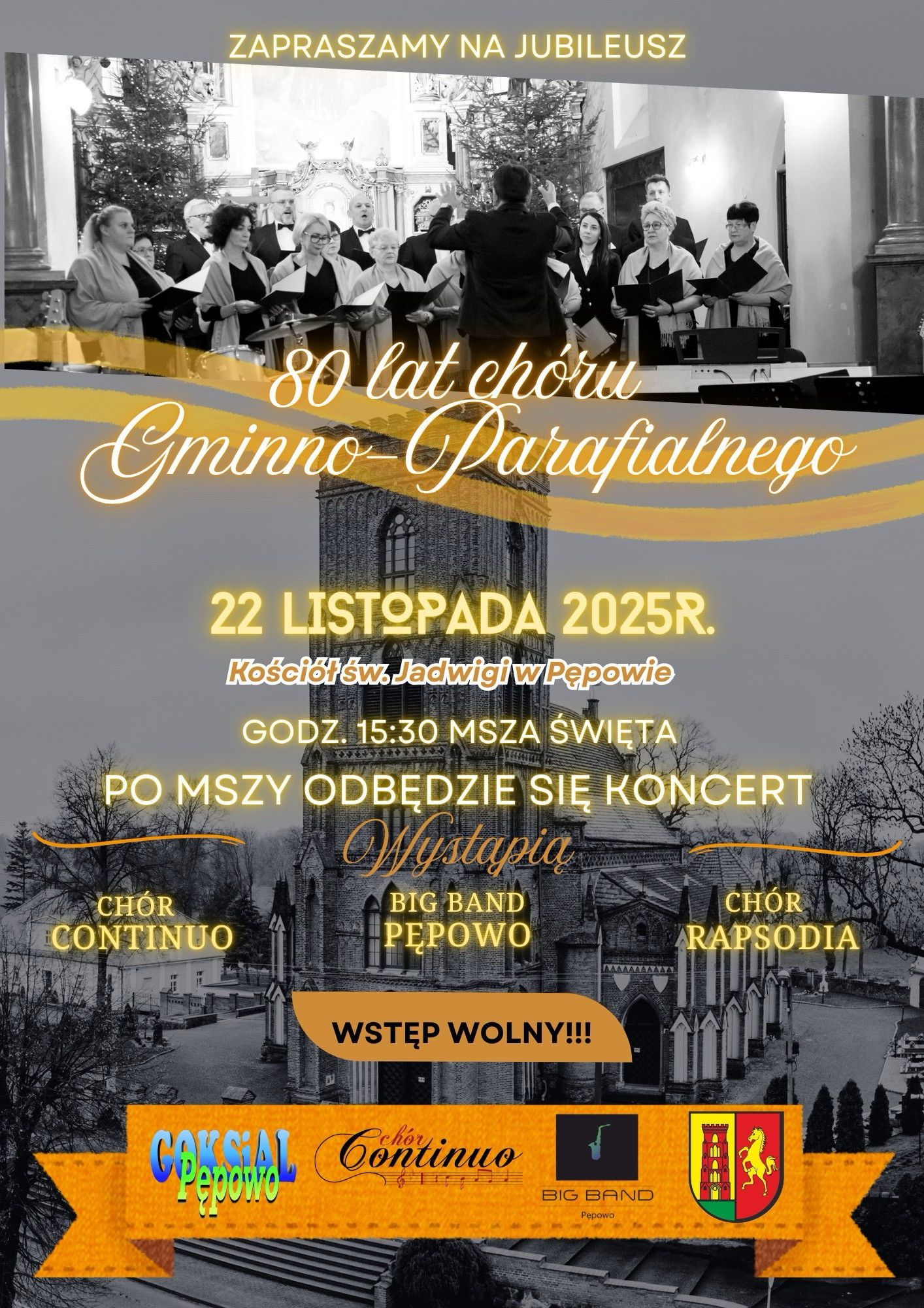 | Miejscowość: Pępowo Miejsce: Kościół św. Jadwigi w Pępowie Data rozpoczęcia: 22.11.2025 15:30:00 Data zakończenia: 22.11.2025 17:30:00 Organizator: Chór Gminno-Parafialny w Pępowie Opis wydarzenia: Chór Gminno – Parafialny CONTINUO zaprasza wszystkich mieszkańców z gminy Pępowo i byłych chórzystów na obchody Jubileuszu 80-lecia Chóru, który odbędzie się 22 listopada tj. sobota, w kościele parafialnym św. Jadwigi w Pępowie. Rozpoczniemy mszą św. o godz. 15:30 i zaraz po mszy odbędzie się koncert jubileuszowy w wykonaniu Chóru CONTINUO z Pępowa, chóru RAPSODIA z Lipna i zespołu BIG BAND z Pępowa. ZAPRASZAMY |