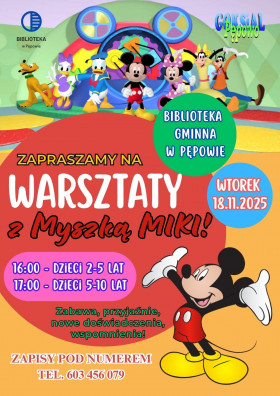 | Miejscowość: Pępowo Miejsce: Gminna Biblioteka Publiczna w Pępowie Data rozpoczęcia: 18.11.2025 16:00:00 Data zakończenia: 18.11.2025 18:00:00 Organizator: GOKSiAL Pępowo Opis wydarzenia: Święto Myszki Miki w naszej bibliotece! Czy wiecie, że 18 listopada obchodzimy Dzień Myszki Miki Z tej okazji zapraszamy wszystkie dzieci na wyjątkowe warsztaty z okazji święta tego bajkowego bohatera! W programie: gry i zabawy inspirowane przygodami Myszki Miki, kreatywne prace plastyczne, wspólne czytanie książki o ulubionych bohaterach z bajek Disneya. To doskonała okazja, by wspólnie spędzić czas, rozbudzić wyobraźnię i odkryć radość czytania! Kiedy: 18 listopada (wtorek) Gdzie: Gminna Biblioteka Publiczna u. Powstańców Wielkopolskich 21 Godzina: 16:00 - dzieci 2-5 lat, 17:00 - dzieci 5-10 lat Udział w warsztatach jest bezpłatny, obowiązują wcześniejsze zapisy pod numerem: 603 456 079. Zapiszcie się już dziś – liczba miejsc jest ograniczona! |