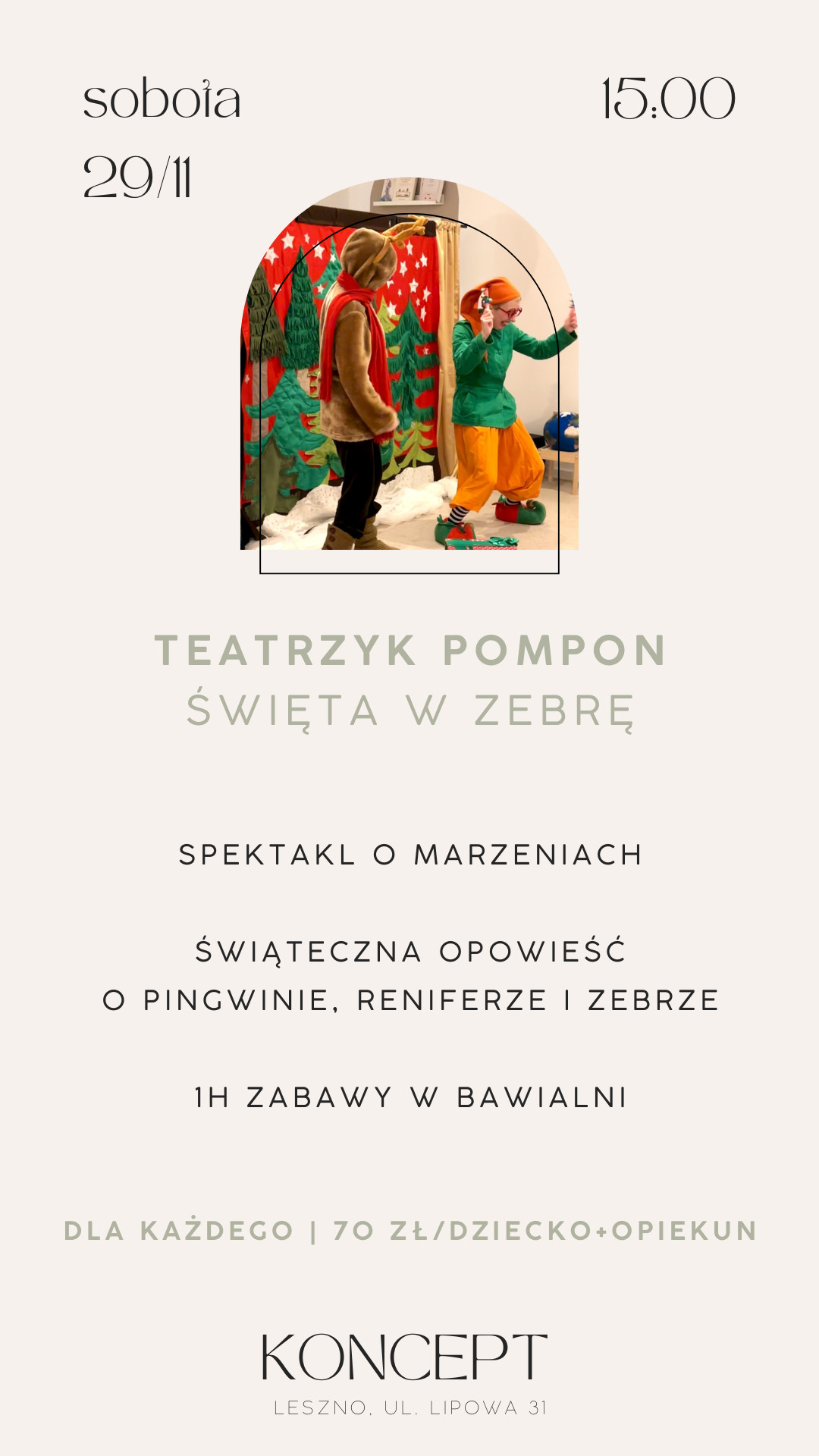 | Miejscowość: Leszno Miejsce: KONCEPT (Leszno, ul. Lipowa 31) Data rozpoczęcia: 29.11.2025 15:00:00 Data zakończenia: 29.11.2025 16:00:00 Organizator: kawiarnia & bawialnia KONCEPT Opis wydarzenia: Tych Pań Wam chyba przedstawiać nie trzeba - siostrzany duet, Dorota i Zosia, czyli innymi słowy znany i lubiany Teatrzyk POMPON kolejny raz wystąpi w KONCEPCIE ze swoimi fantastycznymi przedstawieniami dla dzieci. Zapraszamy w SOBOTĘ 29/11 na godz. 15:00 na Lipową 31. Tym razem wspólnie obejrzymy przedstawienie pt. "ŚWIĘTA W ZEBRĘ". Marzeniem pewnej zebry jest, żeby dostarczyć komuś prezent gwiazdkowy. Marzeniem pewnego pingwina jest, żeby renifer dostarczył mu prezent gwiazdkowy. Czy da się spełnić oba te marzenia za jednym razem? Dzięki pomysłowemu elfowi wszystko jest możliwe! Podpowiemy tylko, że pingwin spędzi ŚWIĘTA W ZEBRĘ! WEJŚCIÓWKA: 70 zł / parę (dziecko + opiekun) Bilet obowiązuje na każde dziecko biorące udział w wydarzeniu. W cenie wliczona jest również 1h swobodnej zabawy w bawialni. Na wydarzenie obowiązują zapisy! Szczegóły na Facebooku @konceptleszno. |