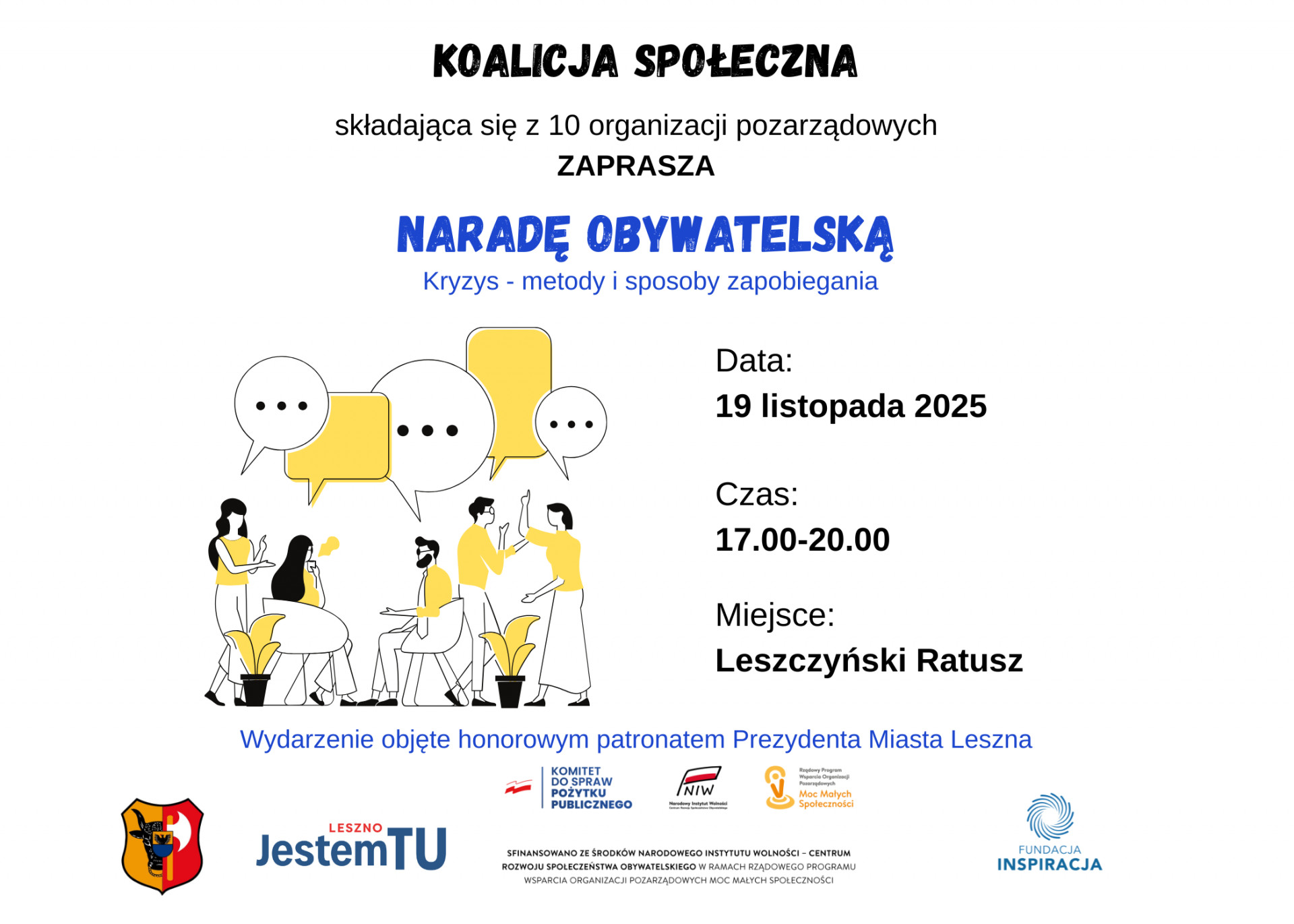 | Miejscowość: Leszno Miejsce: sala konferencyjna w leszczyńskim RATUSZU Data rozpoczęcia: 19.11.2025 17:00:00 Data zakończenia: 19.11.2025 20:00:00 Organizator: Fundacja INSPIRACJA Opis wydarzenia: Jeśli chcecie dowiedzieć się, jak lepiej przygotować się na sytuacje kryzysowe i co możecie zrobić, by im skutecznie zapobiegać, koniecznie weźcie udział w NARADZIE OBYWATELSKIEJ. Jej tematem będzie "Kryzys – metody i sposoby zapobiegania". To kulminacyjny punkt projektu „Energaizer pomocowy odpowiedzią na kryzys”, który gromadzi ludzi gotowych do działania i wspólnego szukania rozwiązań. Podczas spotkania zaproszeni eksperci odpowiedzą na Wasze pytania. Przygotowaliśmy trzy tematyczne stoliki dyskusyjne: - Mobilizacja własna – jak każdy z nas może zadbać o swoje bezpieczeństwo i przygotowanie, - Mobilizacja NGO – rola i współpraca organizacji pozarządowych w czasie kryzysu, - Mobilizacja dla innych – jak wspierać osoby potrzebujące i budować lokalną solidarność. Kto nie może dotrzeć na wydarzenie- proszony o wypełnienie ankiety, która będzie stanowiła wsparcie w naradzie. Link: https://forms.gle/9rjoju9eXwnNrJkZ6 Wydarzenie objęte honorowym patronatem Prezydenta Miasta Leszna. Wydarzenie realizowane ze środków Narodowego Instytutu Wolności-Centrum Rozwoju Społeczeństwa Obywatelskiego w ramach rządowego programu wsparcia organizacji pozarządowych-Moc Małych Społeczności. |