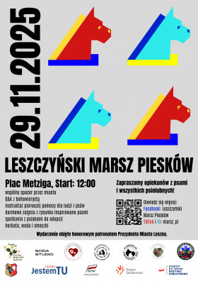 | Miejscowość: Leszno Miejsce: Plac Metziga Data rozpoczęcia: 29.11.2025 12:00:00 Data zakończenia: 29.11.2025 16:00:00 Organizator: Inicjatywa społeczna Opis wydarzenia: Merdające ogony przejmują Leszno! Leszczyński Marsz Piesków – wydarzenie, którego w naszym mieście jeszcze nie było! To wspólny spacer mieszkańców i czworonożnych towarzyszy, którego celem jest promowanie odpowiedzialnej opieki nad zwierzętami oraz budowanie dobrych relacji ludzi z psami i ludzi z ludźmi! Możesz przyjść ze swoim psem, ale nie musisz! Wydarzenie kierowane jest zarówno do opiekunów psów, jak i osób, które po prostu chcą być częścią psiolubnej społeczności! W planie spokojny przemarsz przez miasto, Q&A z behawiorystą, warsztaty pierwszej pomocy, spotkania z podopiecznymi Schroniska w Henrykowie, Boszkowskich Kotów i Psów oraz Fundacji Zwierzęce SOS oraz inne aktywności stworzone przez naszych partnerów! Poznaj szczegóły, dołącz do wydarzenia na Facebooku https://fb.me/e/6NEFMFJhU Śledź Leszczyński Marsz Piesków w mediach społecznościowych i pozostań na bieżąco! Facebook https://www.facebook.com/profile.php?id=61583809949507 Instagram https://www.instagram.com/marsz_pl/ Inicjatywa ma charakter otwarty i międzypokoleniowy. Może wziąć w niej udział każdy, niezależnie od wieku, psa czy doświadczenia! Wydarzenie pod honorowym patronatem Prezydenta Miasta Leszna Zadanie publiczne współfinansowane ze środków NIW w ramach Korpusu Solidarności, rządowego programu wspierania i rozwoju wolontariatu systematycznego na lata 2018-2030. #LeszczyńskiMarszPiesków |