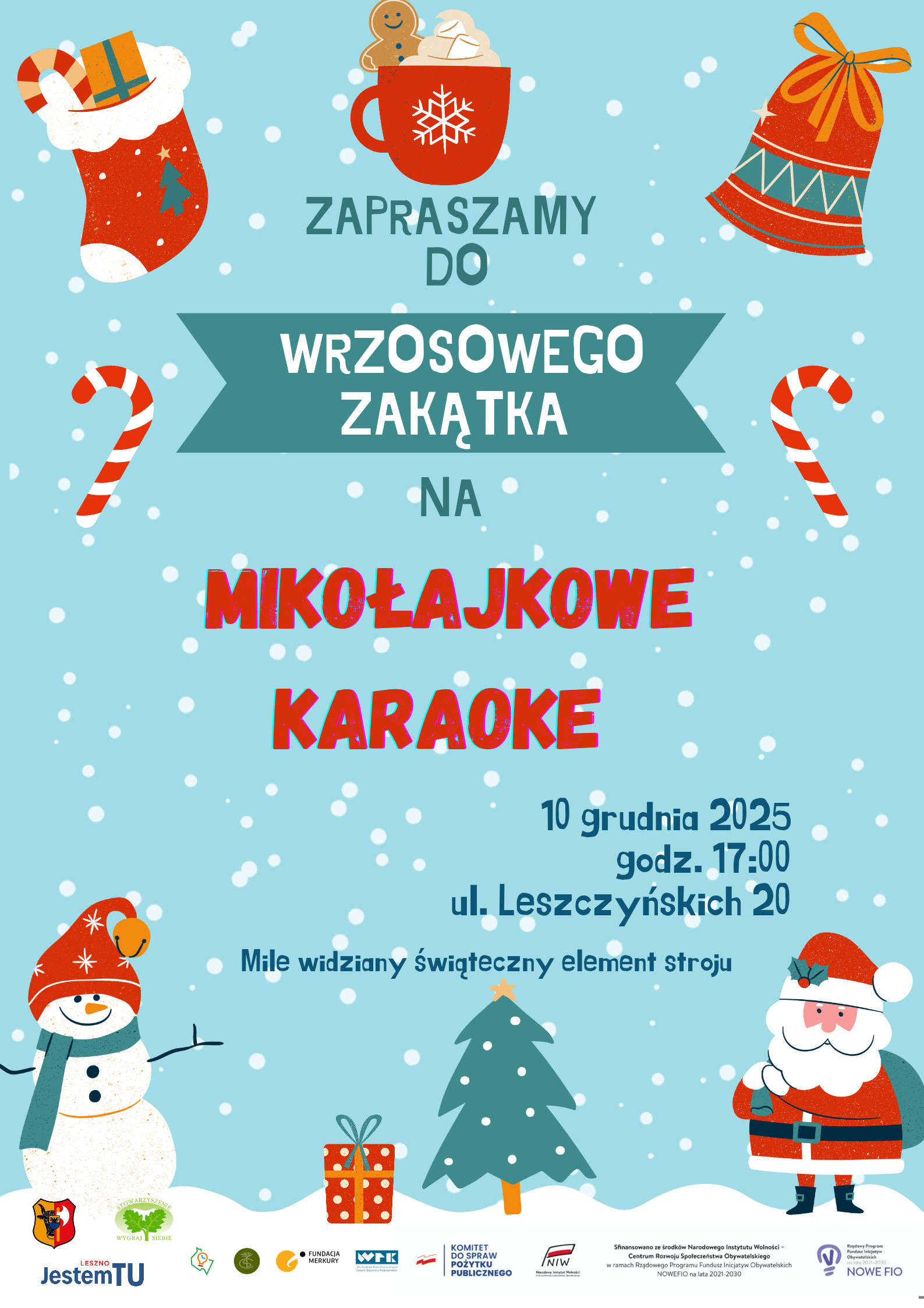 | Miejscowość: Leszno Miejsce: Wrzosowy Zakątek ul. Leszczyńskich 20 Data rozpoczęcia: 10.12.2025 17:00:00 Data zakończenia: 10.12.2025 19:00:00 Organizator: Stowarzyszenie Wygraj Siebie Opis wydarzenia: Zapraszamy na Mikołajkowe karaoke! Zapraszamy na kolejne spotkanie z mikrofonem w roli głównej! Czeka na Was świetna atmosfera, znane i lubiane hity oraz okazja, by dobrze się bawić! ? 10.12.2025 ? 17:00 ? Wrzosowy Zakątek ul. Leszczyńskich 20 Nie musisz być profesjonalistą - wystarczy, że masz ochotę śpiewać! Zabierz znajomych i spędź z nami muzyczne popołudnie! Mile widziany świąteczny element stroju! Poczuj z nami klimat zbliżających się świąt. |