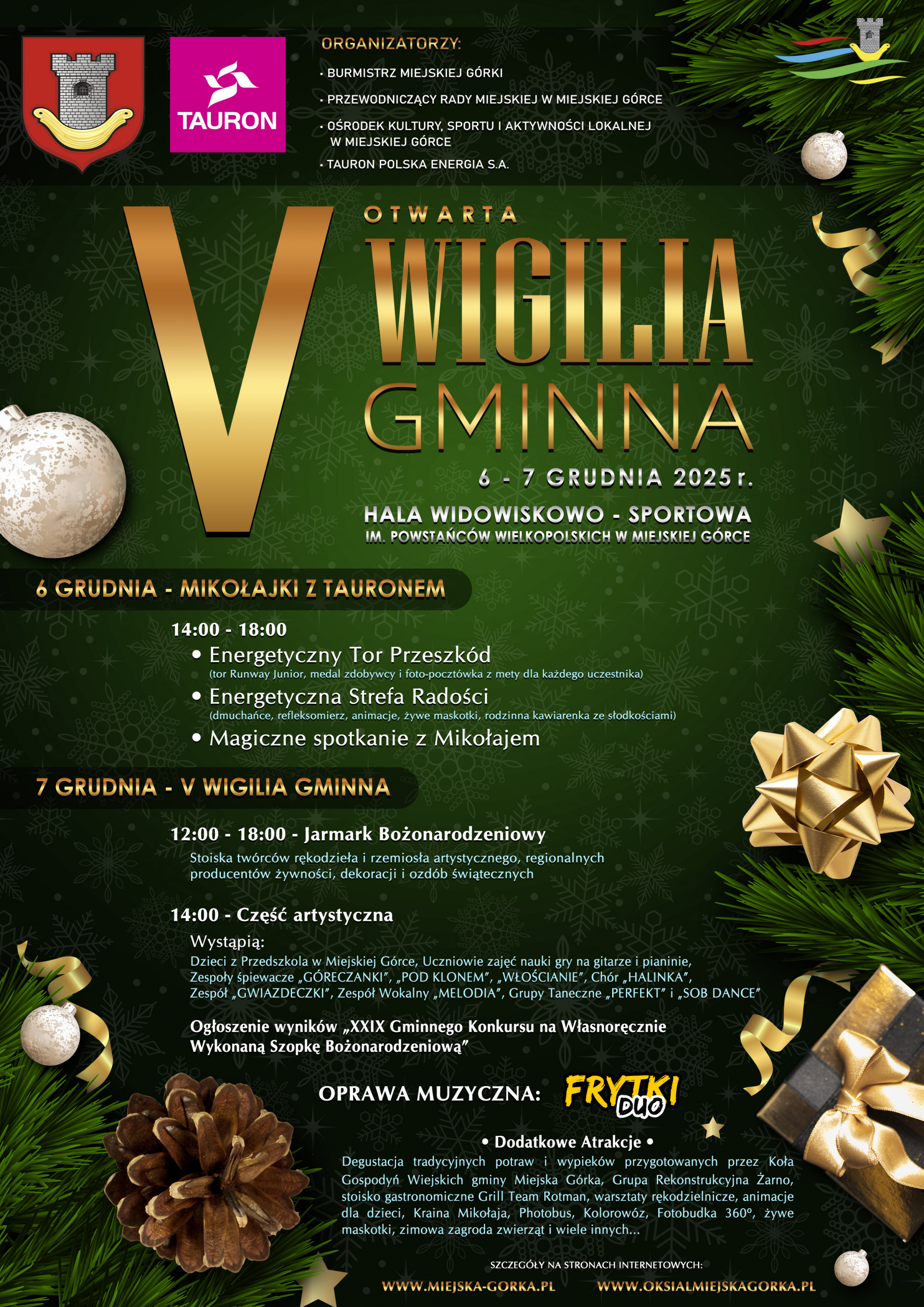 | Miejscowość: Miejska Górka Miejsce: Hala Widowiskowo - Sportowa im. Powstańców Wielkopolskich Data rozpoczęcia: 06.12.2025 14:00:00 Data zakończenia: 07.12.2025 18:00:00 Organizator: Burmistrz Miejskiej Górki, Przewodniczący Rady Miejskiej w Miejskiej Górce, Ośrodek Kultury, Sportu i Aktywności Lokalnej w Miejskiej Górce, Tauron Polska Energia S.A. Opis wydarzenia: DWA DNI PEŁNE NIESPODZIANEK – DOŁĄCZ DO NAS! --------------------------------------- Początek grudnia w gminie Miejska Górka zapowiada się naprawdę ekscytująco! Przed nami dwa dni pełne radości i świątecznego ciepła, które wprowadzą wszystkich gości w atmosferę nadchodzących Świąt Bożego Narodzenia. Już w sobotę, 6 grudnia, zapraszamy na energetyczne i pełne niespodzianek MIKOŁAJKI z TAURONEM. W programie znajdą się atrakcje, które zapewnią całym rodzinom mnóstwo radości i aktywnej zabawy. Największą atrakcją będzie energetyczny tor przeszkód „Runway Junior”, gdzie uczestnik będzie mógł sprawdzić swoją zwinność, szybkość i refleks. Po pokonaniu toru każdy otrzyma medal zdobywcy oraz wyjątkową foto - pocztówkę z mety, która uwieczni jego udział w wydarzeniu. Dzieci będą mogły również korzystać z kolorowych dmuchańców, swobodnie skakać i bawić się bez końca, a także sprawdzić swoje umiejętności i refleks przy refleksomierzu. Całość uzupełnią świąteczne animacje, prowadzone przez doświadczonych animatorów, którzy wprowadzą najmłodszych w magiczny, świąteczny świat zabawy. Nie zabraknie też rodzinnej kawiarenki ze słodkościami, gdzie każdy będzie mógł odpocząć przy aromatycznej kawie czy gorącej czekoladzie, oraz skosztować domowych ciast i innych smakołyków. Szczególną atrakcją będzie spotkanie z Mikołajem, dzieci będą mogły zrobić sobie z nim zdjęcie i opowiedzieć mu o swoich świątecznych marzeniach. MIKOŁAJKI Z TAURONEM to wydarzenie, które łączy aktywną zabawę, kreatywność i świąteczne emocje, tworząc idealną przestrzeń do wspólnego, rodzinnego spędzenia czasu. W niedzielę, 7 grudnia zapraszamy na magiczną, pełną ciepła i tradycji WIGILIĘ GMINNĄ, która już od południa wypełni Miejską Górkę blaskiem świątecznych świateł, zapachem pierników i radosnym brzmieniem kolęd. Od godziny 12:00 ruszy Jarmark Bożonarodzeniowy, który zamieni miejsce wydarzenia w prawdziwą, zimową krainę świątecznych cudów. Wśród pięknie udekorowanych stoisk znajdą się wyjątkowe rękodzieła, artystyczne rzemiosło, regionalne specjały, a także ozdoby i dekoracje, dzięki którym każdy znajdzie coś dla siebie – od podarunków z duszą po tradycyjne smakołyki. Część artystyczna wprowadzi wszystkich w niezwykły, bożonarodzeniowy nastrój. Scenę wypełni muzyka, śpiew i taniec , tworząc ciepłą, rodzinną atmosferę pełną świątecznej magii. Zaprezentują się dzieci z Przedszkola w Miejskiej Górce i uczniowie zajęć gry na gitarze i pianinie prowadzonych w OKSiAL, , które swoim występem przypomną o radości oczekiwania na Święta. Na scenie pojawią się również zespoły, które od lat pielęgnują lokalne tradycje śpiewu: „Góreczanki”, „Pod Klonem” oraz „Włościanie”, niosąc ze sobą brzmienie nastrojowych pastorałek. W kolędowych i zimowych utworach usłyszymy Zespół Wokalny „Melodia”, a energii dodadzą grupy taneczne „Perfekt” i „Sob – Dance”. Wyjątkowego klimatu dopełni występ chóru „Halinka” oraz młodzieżowego kwintetu „Gwiazdki” z Zespołu Szkolno-Przedszkolnego w Konarach, które zaprezentują się w odświętnych aranżacjach. Całość programu połączy muzyczna oprawa w wykonaniu zespołu „Frytki Duo”, który będzie towarzyszył wszystkim odwiedzającym, wypełniając przestrzeń melodiami idealnymi na zimowe popołudnie. Poza bogatą częścią artystyczną uczestnicy Wigilii Gminnej będą mieli okazję skorzystać z wielu dodatkowych atrakcji, które nadadzą wydarzeniu wyjątkowy, rodzinny i świąteczny charakter. Jak zawsze, oryginalnymi smakami zaskoczą panie z Kół Gospodyń Wiejskich z gminy Miejska Górka, serwując dania tradycyjne wigilijne potrawy, słodkie ciasta i lokalne specjały. Wydarzenie będzie też okazją do wykazania się kreatywnością przez najmłodszych w przygotowanych dla nich warsztatach rękodzielniczych, gdzie pod okiem instruktorów powstaną ozdoby i pamiątki w świątecznym stylu. Z pewnością ucieszą ich też radosne animacje, pełne zabaw i aktywności, a także magia Krainy Mikołaja, gdzie będzie można spotkać się z samym Świętym i zrobić sobie pamiątkowe zdjęcie. Stworzyć miłe wspomnienia pozwoli także wyjątkowy Photobus i fotobudka 360, które uwiecznią niepowtarzalne chwile. Gości powitają żywe maskotki, niosące dużo uśmiechu i pozytywnej atmosfery. Kolejną atrakcją będzie zimowa zagroda zwierząt, która pozwoli najmłodszym zobaczyć z bliska sympatyczne, oswojone osiołki i alpaki. Podczas wigilii odbędzie się również podsumowanie i ogłoszenie wyników XXIX Gminnego Konkursu „Na własnoręcznie wykonaną Szopkę Bożonarodzeniową”. WIGILIA GMINNA w Miejskiej Górce, to nie tylko wydarzenie – to wspólne przeżywanie świątecznej magii, czas pełen wzruszeń, tradycji i rodzinnej bliskości. Zapraszamy wszystkich, którzy chcą poczuć wyjątkowy klimat nadchodzących Świąt Bożego Narodzenia. Niech te dwa dni będą pełne radości, uśmiechu i świątecznego ciepła, które zostanie z nami na cały grudzień. |