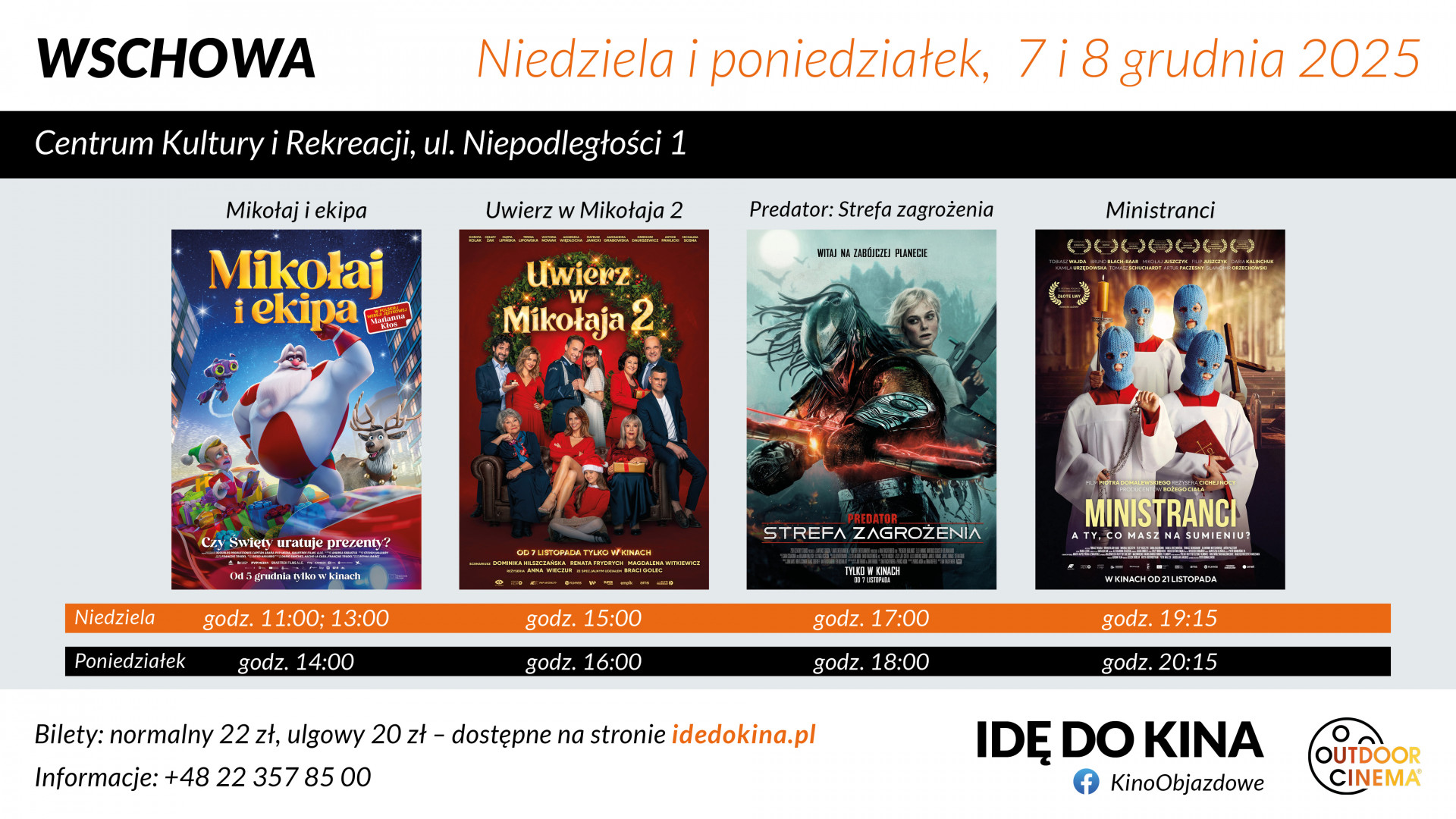 | Miejscowość: Wschowa Miejsce: Sala widowiskowa CKiR Data rozpoczęcia: 07.12.2025 09:00:00 Data zakończenia: 08.12.2025 20:00:00 Organizator: Centrum Kultury i Rekreacji Opis wydarzenia: WSCHOWA – 7 i 8 grudnia 2025! Zapraszamy do Centrum Kultury i Rekreacji przy ul. Niepodległości 1, gdzie czeka na Was świetny repertuar na niedzielę i poniedziałek! Mikołaj i ekipa – pełna humoru animacja dla całej rodziny Niedziela: 11:00, 13:00 Poniedziałek: 14:00 Uwierz w Mikołaja 2 – komedia świąteczna w gwiazdorskiej obsadzie Niedziela: 15:00 Poniedziałek: 16:00 Predator: Strefa zagrożenia – kino akcji dla fanów mocnych wrażeń Niedziela: 17:00 Poniedziałek: 18:00 Ministranci – poruszający dramat z aktualnym przesłaniem Niedziela: 19:15 Poniedziałek: 20:15 Bilety: normalny 22 zł, ulgowy 20 zł Dostępne na: idedokina.pl Niedziela: https://idedokina.pl/trasa_kina/szczegoly/1147 Poniedziałek: https://idedokina.pl/trasa_kina/szczegoly/1148 |