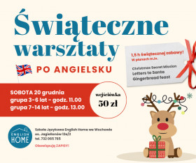 | Miejscowość: Wschowa Miejsce: English Home - szkoła językowa dla dzieci i młodzieży (os. Jagiellonów 12e/2, Wschowa) Data rozpoczęcia: 20.12.2025 11:00:00 Data zakończenia: 20.12.2025 14:30:00 Organizator: English Home - szkoła językowa dla dzieci i młodzieży we Wschowie Opis wydarzenia: Zapraszamy wszystkie dzieci w wieku 3-14 lat na ŚWIĄTECZNE WARSZTATY PO ANGIELSKU we Wschowie Warsztaty odbędą się w SOBOTĘ, 20 GRUDNIA i w zależności od wieku uczestników dostępne są dwa terminy: godz. 11.00-12.30 dla dzieci w wieku 3-6 lat godz. 13.00-14.30 dla dzieci w wieku 7-14 lat Każdy będzie mógł wziąć udział w świątecznych zabawach dostosowanych do wieku i umiejętności uczestników, między innymi: Christmas Secret Mission Gingerbread feast Letters to Santa Christmas games and puzzles Singing Christmas songs Christmas reading time Udział w warsztatach kosztuje 50 zł. Żeby się zapisać należy wypełnić formularz poniżej. Na końcu formularz przekieruje Was do płatności. ZAPISY: Dla dzieci 3-6 lat: https://tiny.pl/tjj5ffww Dla dzieci 7-14 lat: https://tiny.pl/336y346t Pozdrawiamy cieplutko, Szkoła Językowa English Home Tel. +48 732 065 765 |