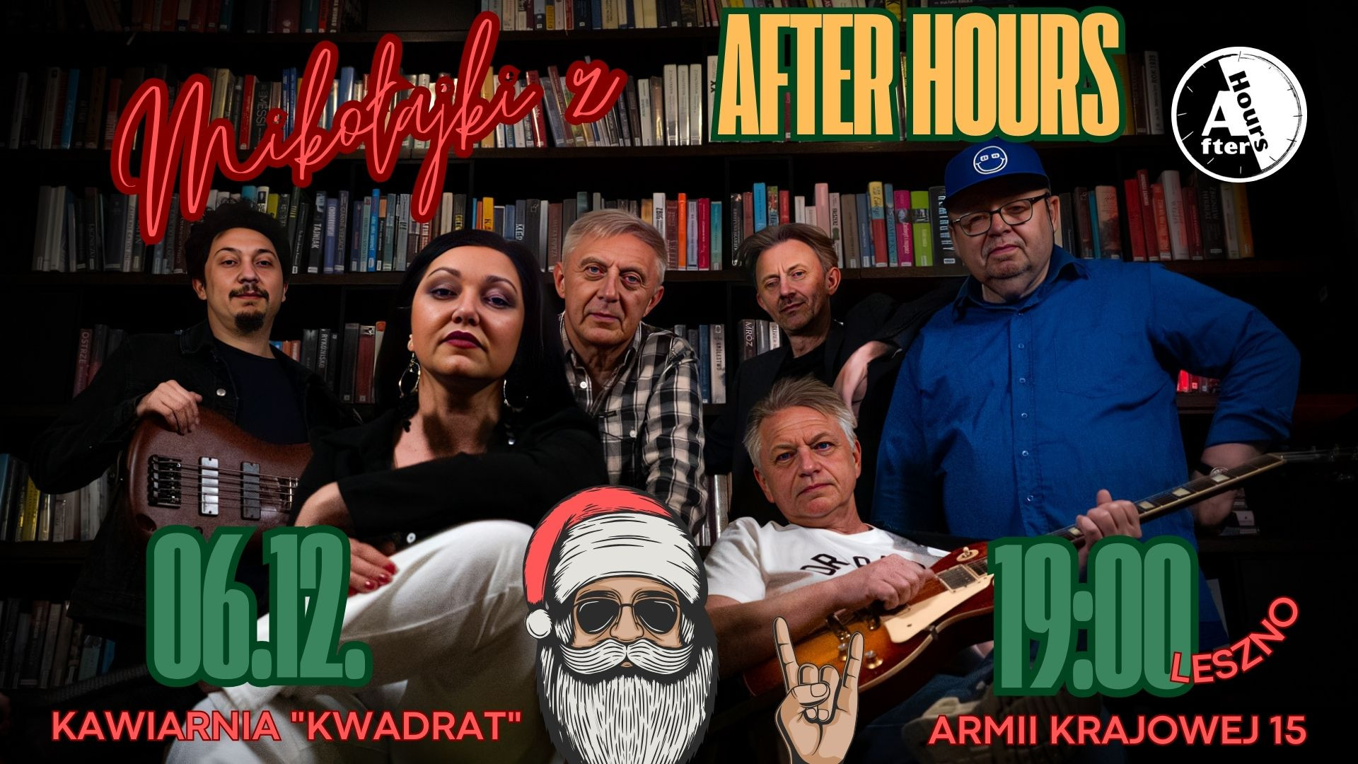| Miejscowość: Leszno Miejsce: Kawiarnia Kwadrat ul.Armii Krajowej 15 Data rozpoczęcia: 06.12.2025 19:00:00 Data zakończenia: 06.12.2025 22:00:00 Organizator: After Hours Opis wydarzenia: Mikołajkowy koncert zespołu After Hours w kawiarni KWADRAT |