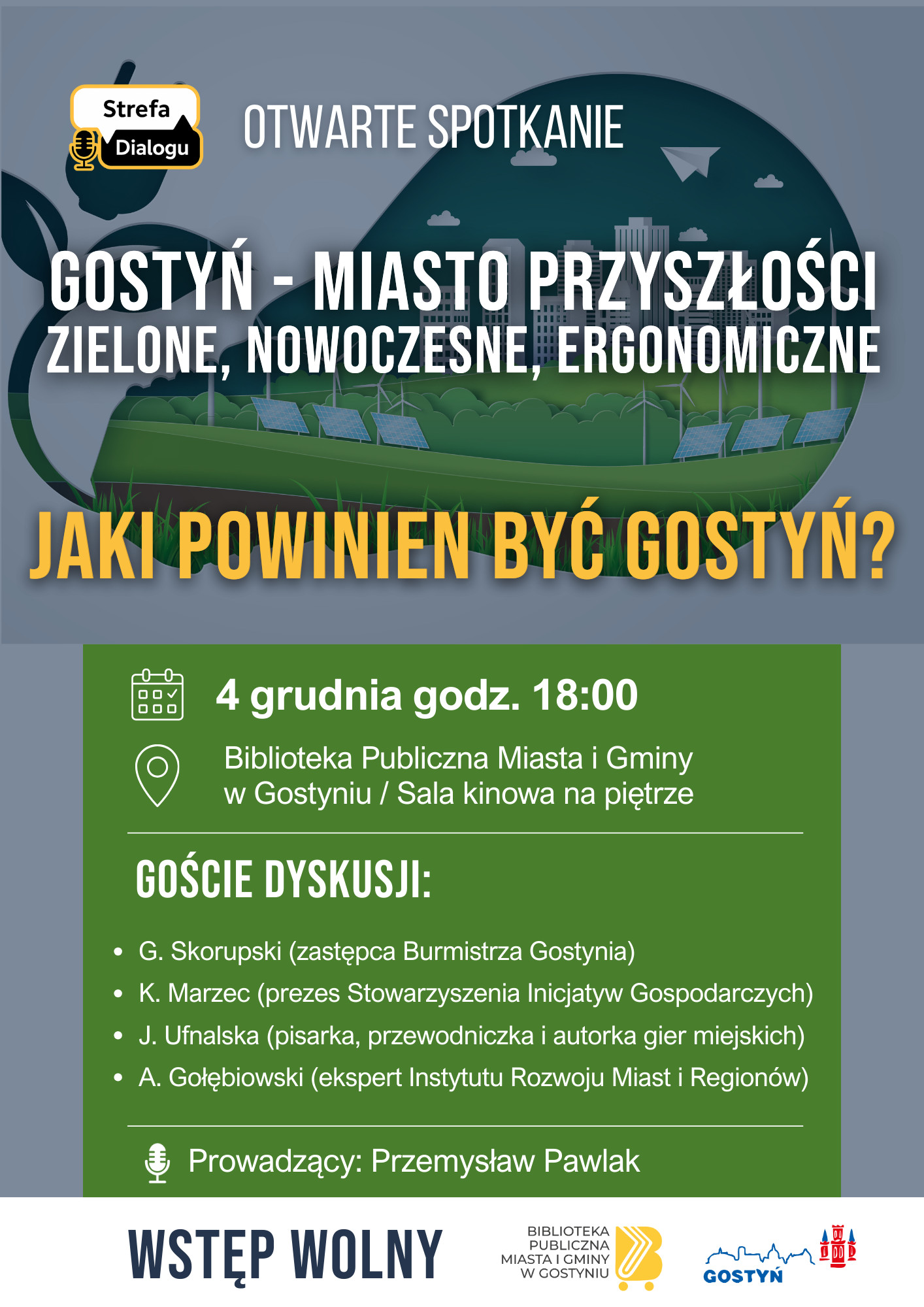 | Miejscowość: Gostyń Miejsce: Biblioteka w Gostyniu Data rozpoczęcia: 04.12.2025 18:00:00 Data zakończenia: 04.12.2025 20:00:00 Organizator: Biblioteka Publiczna Miasta i Gminy w Gostyniu Opis wydarzenia: Gostyń – miasto przyszłości: zielone, nowoczesne, ergonomiczne. Jaki powinien być? | Strefa Dialogu Data: czwartek, 4 grudnia 2025 Godzina: 18:00 Miejsce: Sala kinowa na piętrze | Biblioteka Publiczna Miasta i Gminy w Gostyniu Już 4 grudnia o godz. 18.00 w Bibliotece Publicznej Miasta i Gminy w Gostyniu zapraszamy na kolejne spotkanie z cyklu „Strefa Dialogu”. Tym razem porozmawiamy o przyszłości naszego miasta: „Gostyń – miasto przyszłości: zielone, nowoczesne, ergonomiczne. Jaki powinien być?” Jaki będzie Gostyń za 10, 20… 50 lat? Czy w Gostyniu chce się żyć? Czy warto do miasta wracać? Czy w grodzie nad Kanią są możliwości rozwojowe? Praca? Mieszkania? Dobrobyt? Kultura? Rozrywka? Rozwój osobisty? Jak nasze miasto wygląda na tle innych porównywalnych ośrodków? Czy wpisuje się w trendy rozwojowe? Czy jest wygodne infrastrukturalnie, sprawne pod względem usług publicznych i prężne życiem społecznym? Czy posiada ruchy miejskie? Czy istnieje w nim partycypacja obywatelska? Jak wyglądają zielone płuca Gostynia? Nasze marzenia o Gostyniu – czyje (dla kogo) jest miasto? W dyskusji udział wezmą: G. Skorupski – Zastępca Burmistrza Gostynia K. Marzec – Prezes Stowarzyszenia Inicjatyw Gospodarczych J. Ufnalska – Pisarka, przewodniczka i autorka gier miejskich A. Gołębiowski – Ekspert Instytutu Rozwoju Miast i Regionów Prowadzący: Przemysław Pawlak Wstęp wolny! Przyjdź i zabierz głos! |
