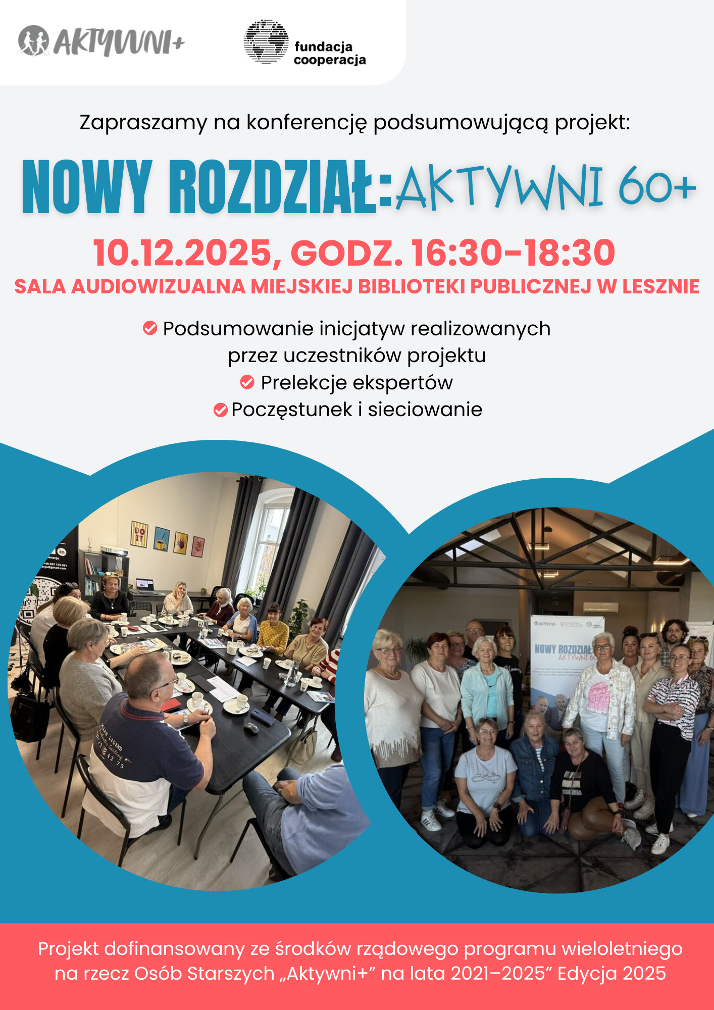 | Miejscowość: Leszno Miejsce: Sala audiowizualna Miejskiej Biblioteki Publicznej im. Stanisława Grochowiaka w Lesznie Data rozpoczęcia: 10.12.2025 16:30:00 Data zakończenia: 10.12.2025 18:30:00 Organizator: Fundacja Cooperacja Opis wydarzenia: Przez ostatnie miesiące uczestnicy i uczestniczki projektu „Nowy Rozdział: Aktywni 60+” odkrywali siebie na nowo – brali udział w warsztatach rozwojowych, budowali relacje, a przede wszystkim – organizowali własne inicjatywy lokalne. Każda z nich była dowodem na to, że aktywność, wpływ i pasja nie mają metryki. Teraz przyszedł czas, by wspólnie podsumować ten wyjątkowy proces i podzielić się doświadczeniami. Kiedy? 10 grudnia 2025 r. (środa) Czas? Godz. 16:30–18:30 Gdzie? Sala audiowizualna Miejskiej Biblioteki Publicznej w Lesznie W programie: - prezentacje uczestników i ich inicjatyw, - prelekcja Sebastiana Ciszewskiego – trenera, coacha i facylitatora – o aktywności społecznej po 60-tce, - prelekcja dr. Jacka Borocha – trenera kompetencji miękkich i eksperta ds. zdrowia – o dobrostanie i poczuciu sensu w wieku senioralnym, - wspólny poczęstunek i czas na rozmowę. Konferencja jest otwarta dla osób w wieku 60+ – zapraszamy wszystkich zainteresowanych! Z uwagi na ograniczoną liczbę miejsc obowiązują zapisy SMS/telefonicznie pod numerem 507 176 951 (Ewelina Lasota) Projekt dofinansowany ze środków rządowego programu wieloletniego na rzecz Osób Starszych "Aktywni+" na lata 2021-2025. Edycja 2025 |