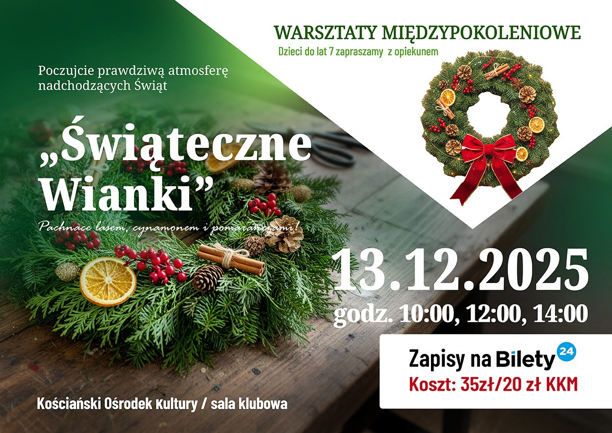 | Miejscowość: Kościan Miejsce: Kościański Ośrodek Kultury Data rozpoczęcia: 13.12.2025 10:00:00 Data zakończenia: 13.12.2025 16:00:00 Organizator: Kościański Ośrodek Kultury Opis wydarzenia: Międzypokoleniowa Magia Świąt: Zapach Świerku i Cynamonu! |