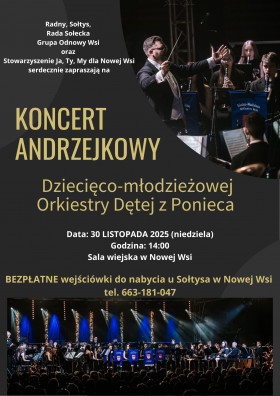 | Miejscowość: Nowa Wieś Miejsce: Sala Wiejska Data rozpoczęcia: 30.11.2025 14:00:00 Data zakończenia: 30.11.2025 17:00:00 Organizator: Radny,Sołtys, Rada Sołecka, Grupa Odnowy Wsi, Stowarzyszenie Ja, Ty, My dla Nowej Wsi Opis wydarzenia: Koncert Młodzieżowej Orkiestry Dętej z Ponieca w Nowej Wsi |
