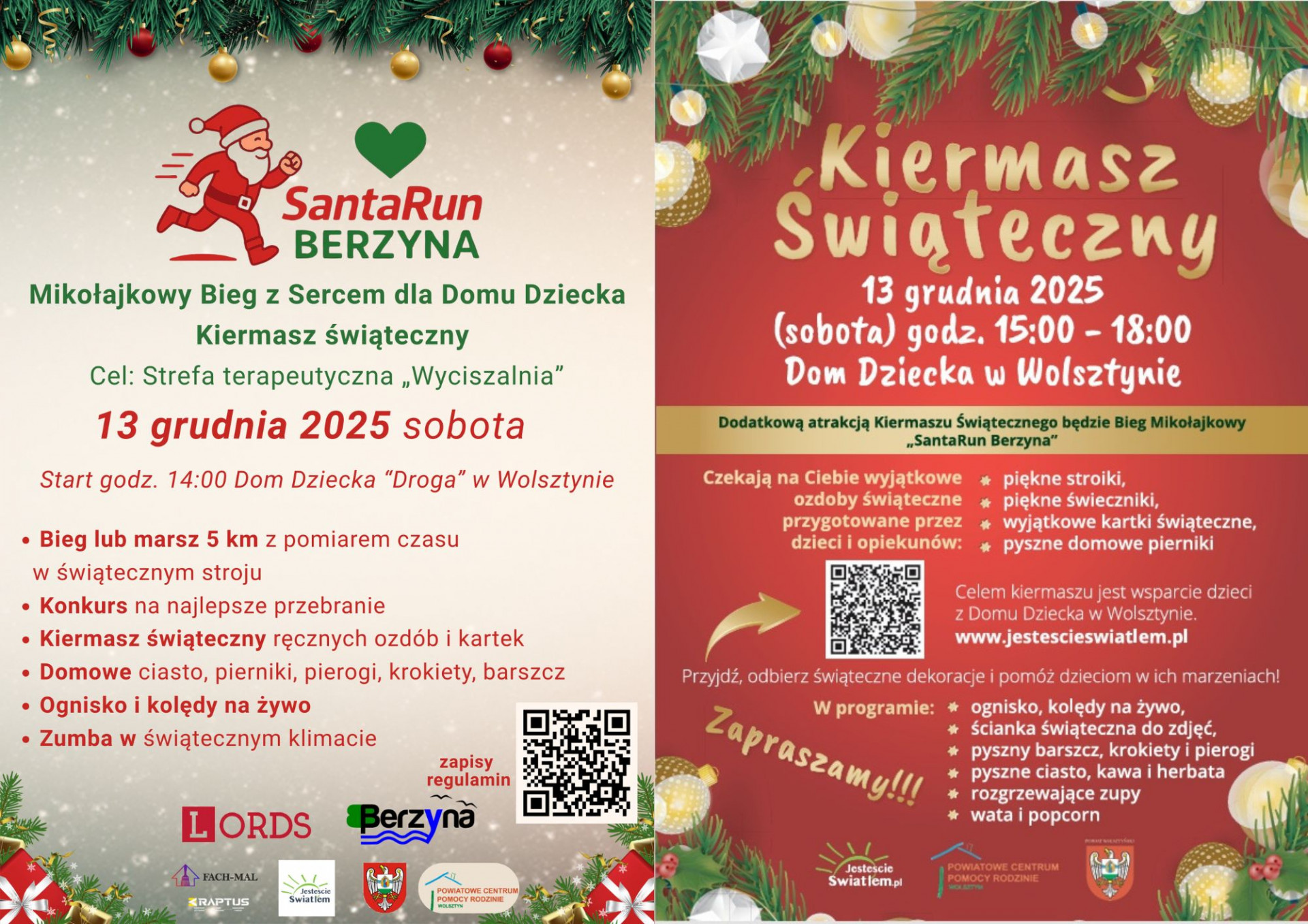 Opis wydarzenia: Bieg charytatywny pn.: „SantaRun Berzyna Mikołajkowy Bieg z Sercem dla Domu Dziecka” organizowany przez Stowarzyszenie LORDS i Sołectwo Berzyna w połączeniu z kiermaszem na terenie Domu Dziecka w Wolsztynie. Info o kiermaszu: https://fb.me/e/8HrD0PIxr