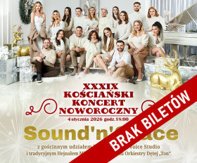 | Miejscowość: Kościan Miejsce: KOK, ul. Mickiewicza 11 Data rozpoczęcia: 04.01.2026 18:00:00 Data zakończenia: 04.01.2026 20:00:00 Organizator: Kościański Ośrodek Kultury Opis wydarzenia: XXXIX Kościański Koncert Noworoczny — wyczekiwane wydarzenie jednoczące nas wokół dobrych życzeń na rozpoczynający się Nowy Rok. Gwiazdą Koncertu 4 stycznia 2026 roku będzie Zespół Sound'n'Grace — formacja, która podbiła serca publiczności pełną harmonii muzyką i niepowtarzalnym brzmieniem wokali. O BĘDZIE MAGIA, PASJA I PROFESJONALIZM W KONCERTOWYM WIDOWISKU MUZYCZNYM. W te niesamowite przeżycia i eksplozję emocji wprowadzi tradycyjnie odegrany przez Trębaczy Orkiestry Dętej "Ton" Hejnał Miasta Kościana. Niespodzianką — wzruszeniem i radością — będzie gościnny udział młodych wokalistów Grupy Voice Studio działającej przy Kościańskim Ośrodku Kultury. Sound'n'Grace Zespół, który od 2005 roku wokół pięknych wokali piosenkarzy i gry instrumentalistów tworzy nastrój i niezapomniane widowiska. Ich muzyka balansuje między popem, soulem, funk, gospel, jazz, groove i akustyczną delikatnością. To unikalny klimat – idealny na wyjątkowy, noworoczny wieczór. W repertuarze zespołu znajdują się standardy gospel, ale też covery pop, soul i R&B. Wybrzmi przebój „Chcemy Więcej”, "Idealnie", "Bliżej" i wiele więcej! Grupę tworzą herosi sceny: wokaliści to laureaci m.in. Opolskich Debiutów, „Szansy na Sukces", „Twojej Drogi do Gwiazd” i Konkursu Piosenki im. Agnieszki Osieckiej. Wielogłosowy śpiew i różnorodność repertuaru oraz Wasza obecność to gwarancja pięknych przeżyć i idealnego wejścia w Nowy 2026 Rok. Zapraszamy na XXXIX KOŚCIAŃSKI KONCERT NOWOROCZNY w rytmie i dźwiękach, które poruszą serca i dodadzą inspiracji, radości i nadziei! Data: 4.01.2026 r. Miejsce: Kościański Ośrodek Kultury, ul. Mickiewicza 11 Godzina: 18:00 Bilety: 95 zł / 75 zł z Kościańską Kartą Mieszkańca Bilet zakupiony na Kościańską Kartę Mieszkańca: Bilet ważny po okazaniu Kościańskiej Karty Mieszkańca przed wejściem na wydarzenie. W przypadku braku karty należy dopłacić do biletu normalnego. Brak biletów! Dziękujemy za tak gorące przyjęcie! Z przykrością, ale i ogromną radością, informujemy, że brak już wolnych miejsc na nasz XXXIX Kościański Koncert Noworoczny. |