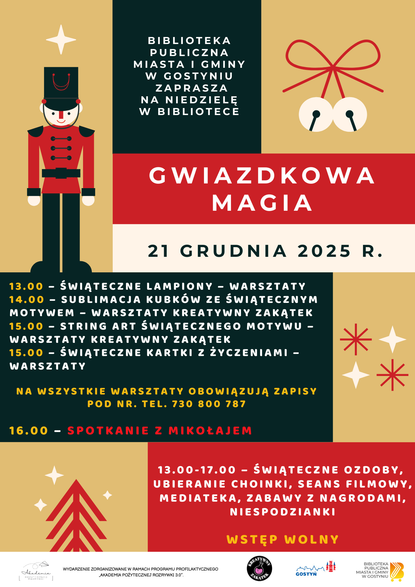 | Miejscowość: Gostyń Miejsce: Biblioteka w Gostyniu Data rozpoczęcia: 21.12.2025 13:00:00 Data zakończenia: 21.12.2025 17:00:00 Organizator: Biblioteka Publiczna Miasta i Gminy w Gostyniu Opis wydarzenia: Data: niedziela 21 grudnia 2025 r. Godzina: 13:00 – 17:00 Miejsce: Biblioteka Publiczna Miasta i Gminy w Gostyniu Zapraszamy na ostatnią w tym roku kalendarzowym Niedzielę w Bibliotece. Już 21 grudnia, w zimowe popołudnie tuż przed świętami, w naszej książnicy pojawi się prawdziwa gwiazdkowa magia. Dla czytelników przygotowaliśmy wiele atrakcji, zwłaszcza związanych ze świątecznym dekorowaniem domu. O godzinie 13:00 rozpoczniemy tworzeniem nastrojowych lampionów ze słoików. Następnie, od 14:00 do 16:00, stery przejmie Helena Łaniecka-Peda z Kreatywnego Zakątku, która wprowadzi dzieci w świat nauki i sztuki — efektem będą kubki oraz malowane nicią obrazy o świątecznej tematyce. W międzyczasie, o godzinie 15:00, odbędzie się kolejna odsłona niezwykle popularnych warsztatów tworzenia bożonarodzeniowych kartek. Na wszystkie te zajęcia obowiązują zapisy pod numerem telefonu 730 800 787 Na uczestników czeka również wiele innych atrakcji. W trakcie wydarzenia będzie można wykonać świąteczne ozdoby i zawiesić je na bibliotecznej choince. Otwarte będą: kino, Mediateka, Oddział dla Dzieci i Młodzieży oraz Wypożyczalnia dla Dorosłych. Przewidziane są także zabawy z nagrodami. Nie może również zabraknąć najważniejszego punktu programu — wizyty św. Mikołaja o godzinie 16:00. Zapraszamy serdecznie! Wspólnie zadbajmy o to, by świąteczny nastrój udzielił się nam wszystkim. Wydarzenie zorganizowano w ramach programu „Akademia Pożytecznej Rozrywki 3.0”. |