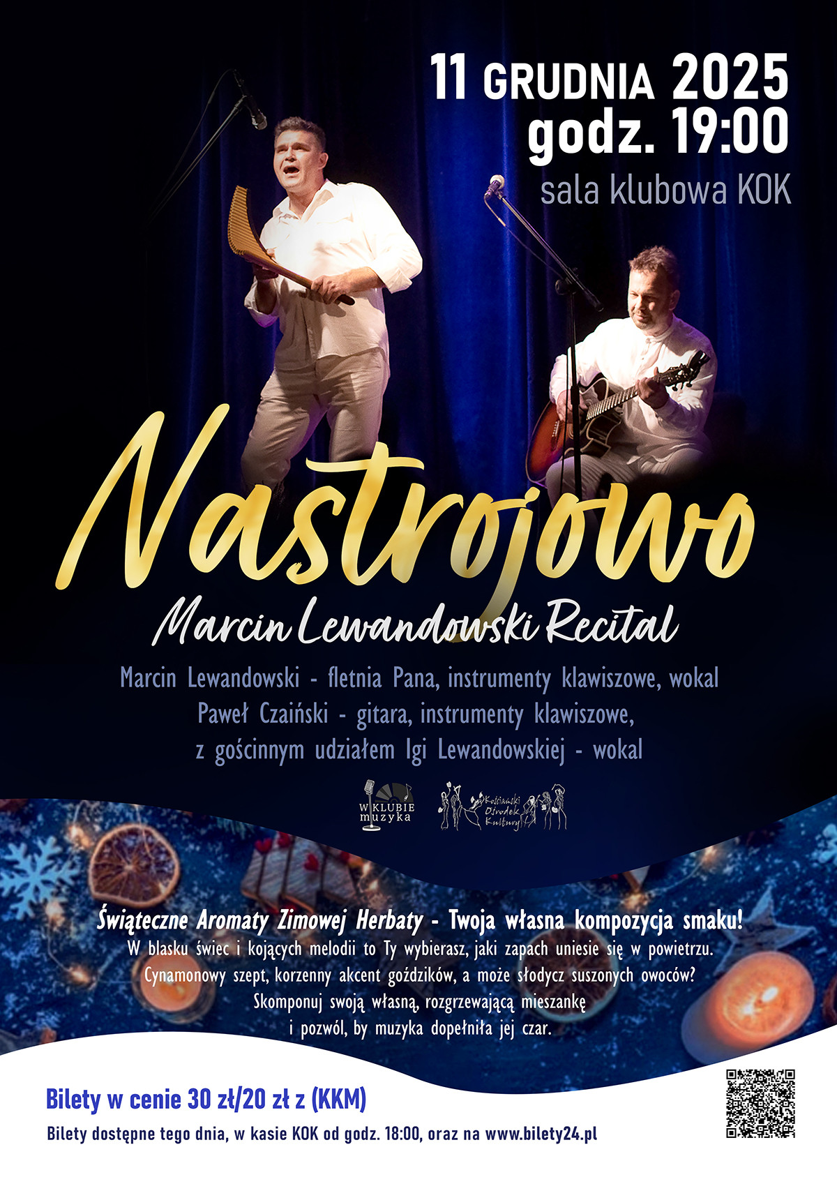 | Miejscowość: Kościan Miejsce: KOK, ul. Mickiewicza 11 Data rozpoczęcia: 11.12.2025 19:00:00 Data zakończenia: 11.12.2025 20:00:00 Organizator: Kościański Ośrodek Kultury Opis wydarzenia: Nastrojowo — Marcin Lewandowski Recital. Wyjątkowy, nastrojowy, wielozmysłowy koncert, bo kiedy muzyka spotyka aromat… powstaje prawdziwa magia! Są wieczory, które zatrzymują czas. Takie, w których dźwięk staje się światłem, a zapach otula jak miękki koc. I właśnie taki wieczór czeka Państwa już 11 grudnia w klubowej sali KOK-u. Zapraszamy na niezwykłe spotkanie z cyklu „W klubie muzyka”, gdzie scenę wypełnią instrumenty, wyjątkowe głosy i emocje, które zostają w pamięci na długo po ostatnim akordzie. Artysta Marcin Lewandowski — pasjonat, samouk, multiinstrumentalista, który od lat przemierza muzyczne ścieżki fletni Pana. Jego brzmienie jest jak powiew górskiego wiatru: niepodrabialne, swobodne, pełne przestrzeni. Łączy tradycję z nowoczesnością, a z tej mieszanki rodzą się dźwięki, które trudno pomylić z czymkolwiek innym. Towarzyszyć mu będą: Paweł Czaiński – gitara, instrumenty klawiszowe Iga Lewandowska – gościnnie, ze swoim delikatnym, emocjonalnym wokalem Ale to jeszcze nie wszystko...tego wieczoru muzyka będzie… smakować! Świąteczne Aromaty Zimowej Herbaty zaproszą do stworzenia własnej, niepowtarzalnej kompozycji. W blasku świec, przy kojących, żywych dźwiękach wybierzesz aromat, który będzie Ci towarzyszył: może cynamonowy szept? Może korzenne muśnięcie goździków, a może słodka nuta suszonych owoców? To Ty zdecydujesz, jak pachnie Twój grudniowy wieczór. To spotkanie dwóch światów — muzyki i zmysłów smaku i zapachu. Jedno i drugie otuli, rozgrzeje i pozwoli na moment głęboko odetchnąć. 11.12.2025, godz. 19:00 Sala klubowa KOK Bilety: 30 zł / 20 zł (KKM) – dostępne w kasie KOK (w dniu koncertu od godz. 18:00) także online na www.bilety24.pl - Kup BILETY » Pozwól muzyce i aromatom opowiedzieć Ci historię, której jeszcze nie słyszałeś. Serdecznie zapraszamy |
