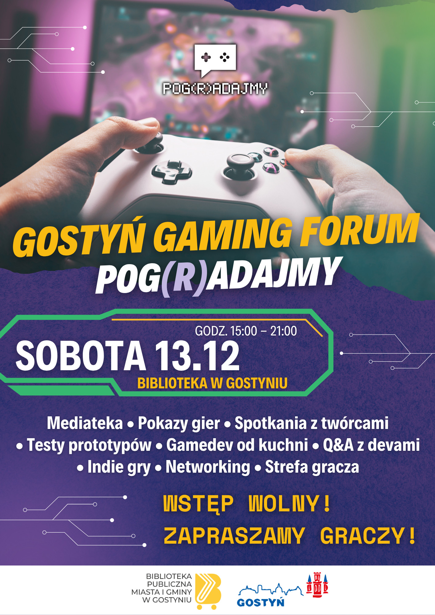 | Miejscowość: Gostyń Miejsce: Biblioteka w Gostyniu Data rozpoczęcia: 13.12.2025 15:00:00 Data zakończenia: 13.12.2025 21:00:00 Organizator: Biblioteka Publiczna Miasta i Gminy w Gostyniu Opis wydarzenia: Pog(R)adajmy – Gostyń Gaming Forum 2025 sobota 13 grudnia 2025 • Biblioteka w Gostyniu Jak wygląda kuchnia gier cyfrowych? Jak robi się gry wideo? Już 13 grudnia świętujemy 2. rocznicę gostyńskiej edycji ogólnopolskiego projektu Pog(R)adajmy - i z tej okazji zamieniamy bibliotekę w prawdziwe centrum gamedevu! Do Gostynia przyjedzie kilkunastu twórców gier, projektantów, grafików, youtuberów i przedstawicieli branży z całej Polski, by w formule non-profit stworzyć nowe, otwarte wydarzenie gamingowe, jakiego w naszym mieście jeszcze nie było! Co Was czeka? • Prezentacje gier i projekty tworzone przez niezależne studia • Bezpośrednie rozmowy z twórcami – od grafików po programistów • Prelekcje, m.in. od Grzegorza Wątroby (Okiem Deva) o tym, jak naprawdę tworzy się gry • Testowanie nowych tytułów i poznawanie branży „od kuchni” • Przyjazna przestrzeń do networkingu, inspiracji i wymiany doświadczeń Wśród gości pojawią się m.in.: Paweł Sobotkowski – Fornixa Games Piotr Stosiek – Anaestethic Antoni Gudejko („Not Until I've Had My Coffee”) Damian Ambroziński – Weles Games Aleksandra Kryształowicz – graficzka Studio Bahchadon („Tandawa”) Dawid Maciejewski – Soaring Pals („Ascendants Realms”) Łukasz Dolata („Awakeroots”) To wyjątkowa okazja dla graczy, rodziców, fanów gamingu i całych rodzin – by lepiej zrozumieć cyfrowe hobby, odkryć świat gamedevu i zobaczyć, że świadomy gaming to nie tylko „pożeracz czasu”, lecz twórcza i rozwijająca pasja. Biblioteka Publiczna Miasta i Gminy w Gostyniu 13 grudnia 2025 Wstęp wolny O POG(R)ADAJMY Pog(R)adajmy to klub dla wszystkich miłośników i pasjonatów gier wideo, działający w naszej bibliotece! Spotkania odbywają się cyklicznie w każdą drugą środę miesiąca w Mediatece. To przestrzeń otwarta dla dzieci i młodzieży, gdzie wspólnie rozmawiamy o grach komputerowych, konsolach, historii gier, a także ich wpływie na kulturę i społeczeństwo. Każde spotkanie to nowy temat — od zagadnień technicznych po ciekawe spojrzenia na reklamę i marketing w grach.Gostyńska edycja „Pog(R)adajmy” jest częścią ogólnopolskiej inicjatywy zapoczątkowanej w 2013 roku przez Michała „Schemata” Wierzbickiego, a lokalnie koordynowana przez Marcina Radczyka. Wydarzenia odbywają się również w takich miastach jak Kraków, Poznań, Warszawa czy Wrocław – a nawet online! |